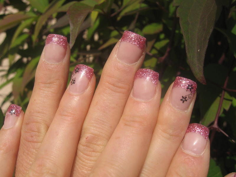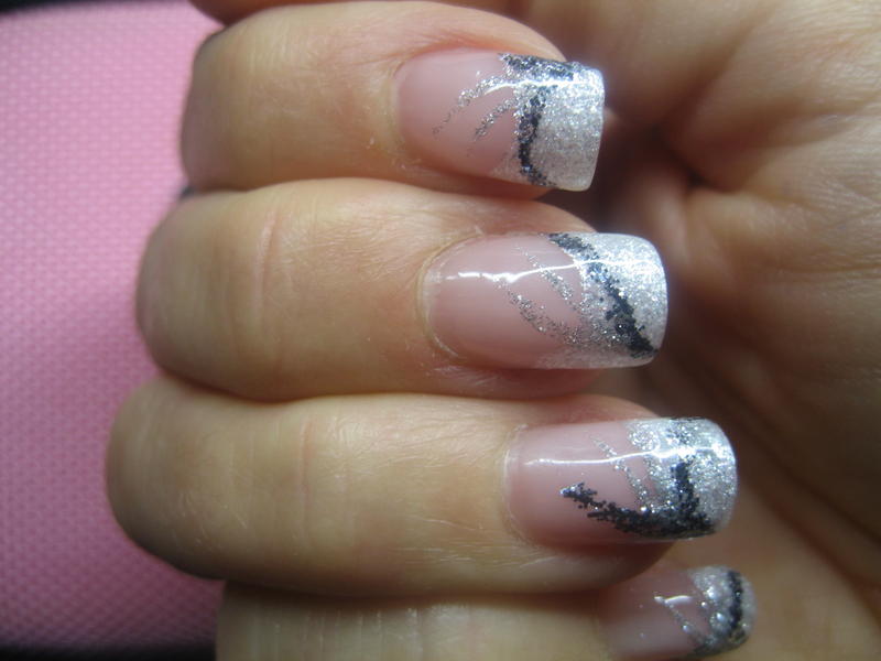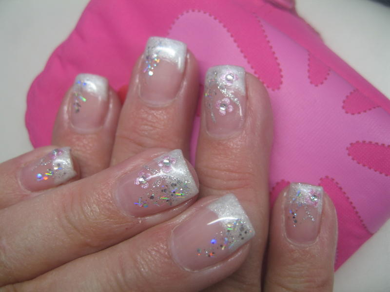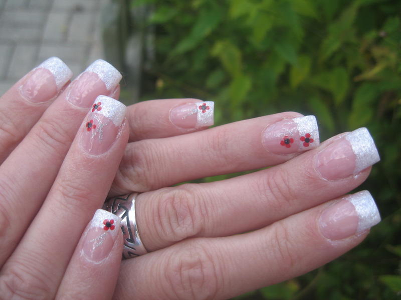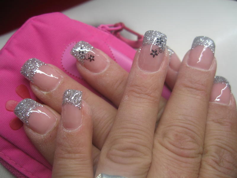 Merciiiii.....french grise...gel transparent avec des paillettes que je mets sur le côté...fleurs avec la peinture de liner où je trempe la pointe du spot pour déposer 4 petits points pour faire la fleur....strass au milieu...petit trait de liner gris pailleté.....et tout ça sous la construction....et il faut matifier au bloc une fois la french catalysée avande de faire le reste...voilà....