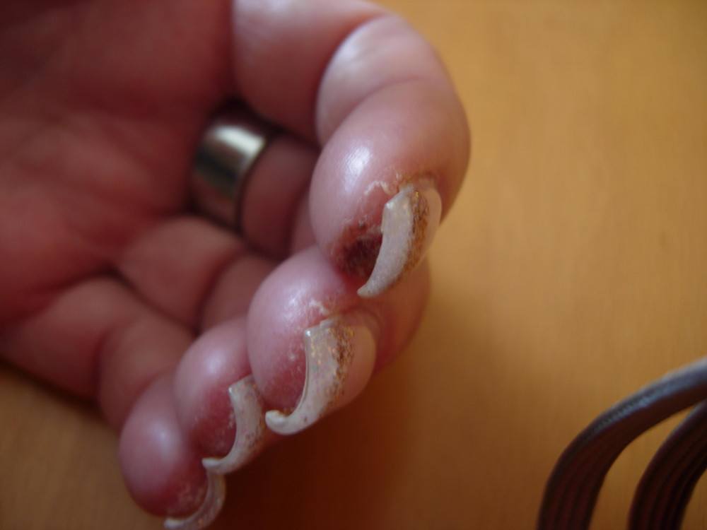 Voilà, j'ai une cliente qui vient depuis longtemps chez moi et la derniere fois qu'elle est venue faire son remplissage elle me dit qu'elle avait toute la peau autour de l'ongles qui partait j'ai trouvé bizare car y avait plus rien alors je lui ai dit de venir si sa posait encore problème, elle vient aujourd'hui CATASTROPHE!!!! j'avais jamais vu ça!! j'ai pensé à de la mycose et là elle me dit que son mari à de la mycose aux pieds et qu'elle lui fait pas mal de massage aux jambes...je lui ai proposer d'aller en pharmacie chercher auelque chose contre la mycose. mais voilà, je suis pas medecin et franchement je suis même pas sur que c'est ça. elle, elle me dit que c'est depuis que j'ai changer mes produits je prends maintenant cesar, avant c'etais les produits akelyn...je suis vachement inquiète je vais lui faire une dépose jeudi