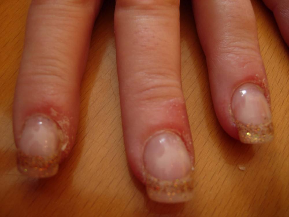 je viens de l'avoir au tel, alors elle me dit qu'elle avait fait une grosse allergie quand elle avait posé des faux ongles mais y a passé 10 ans de ça le medecin lui avait dit de plus refaire! elle est allé à la pharmacie et là on lui a dit que c'étais une allergie! elle prend des comprimés antistaminique et une pommade. ça la gratte mais ça ne sent rien.
