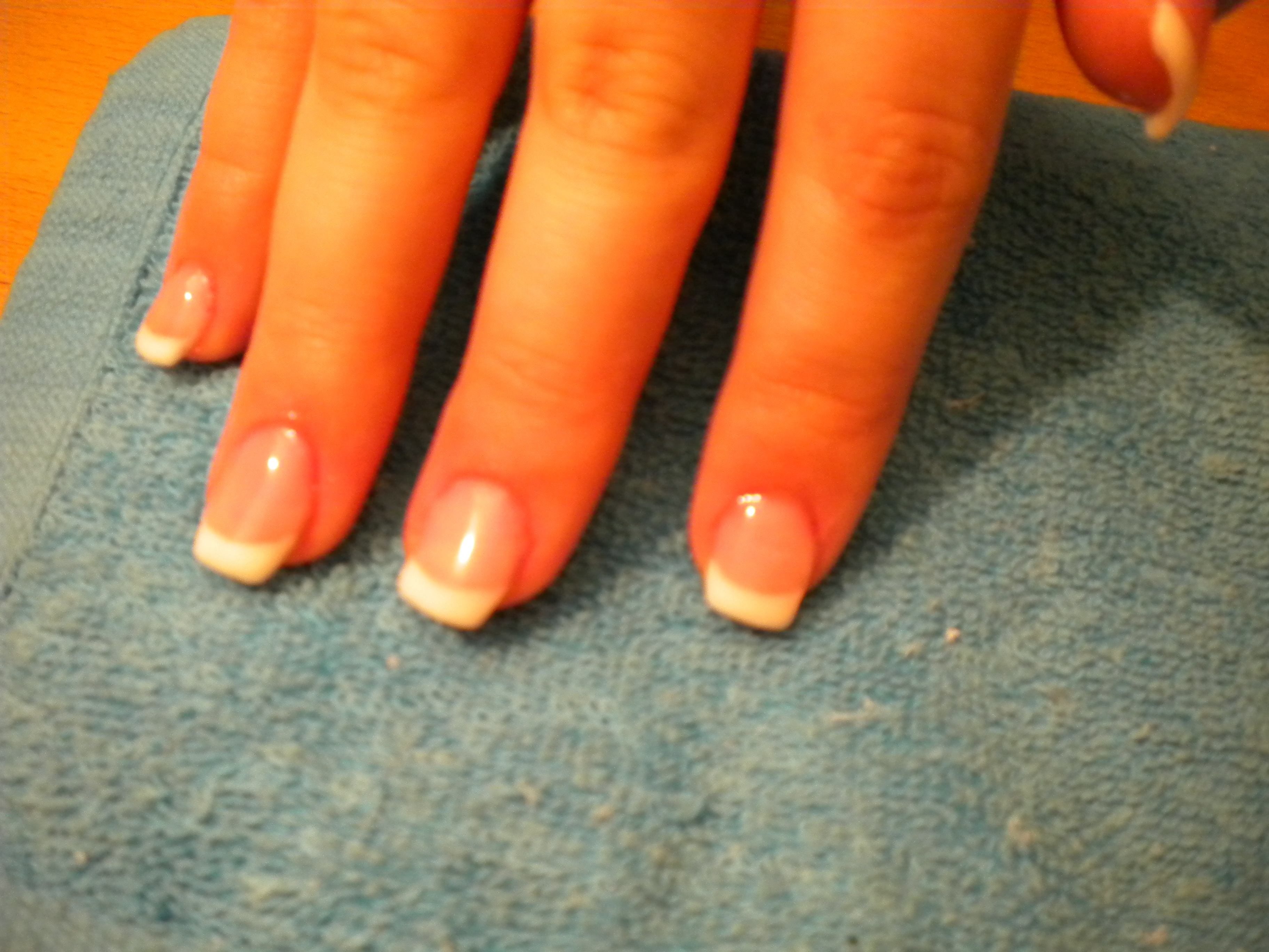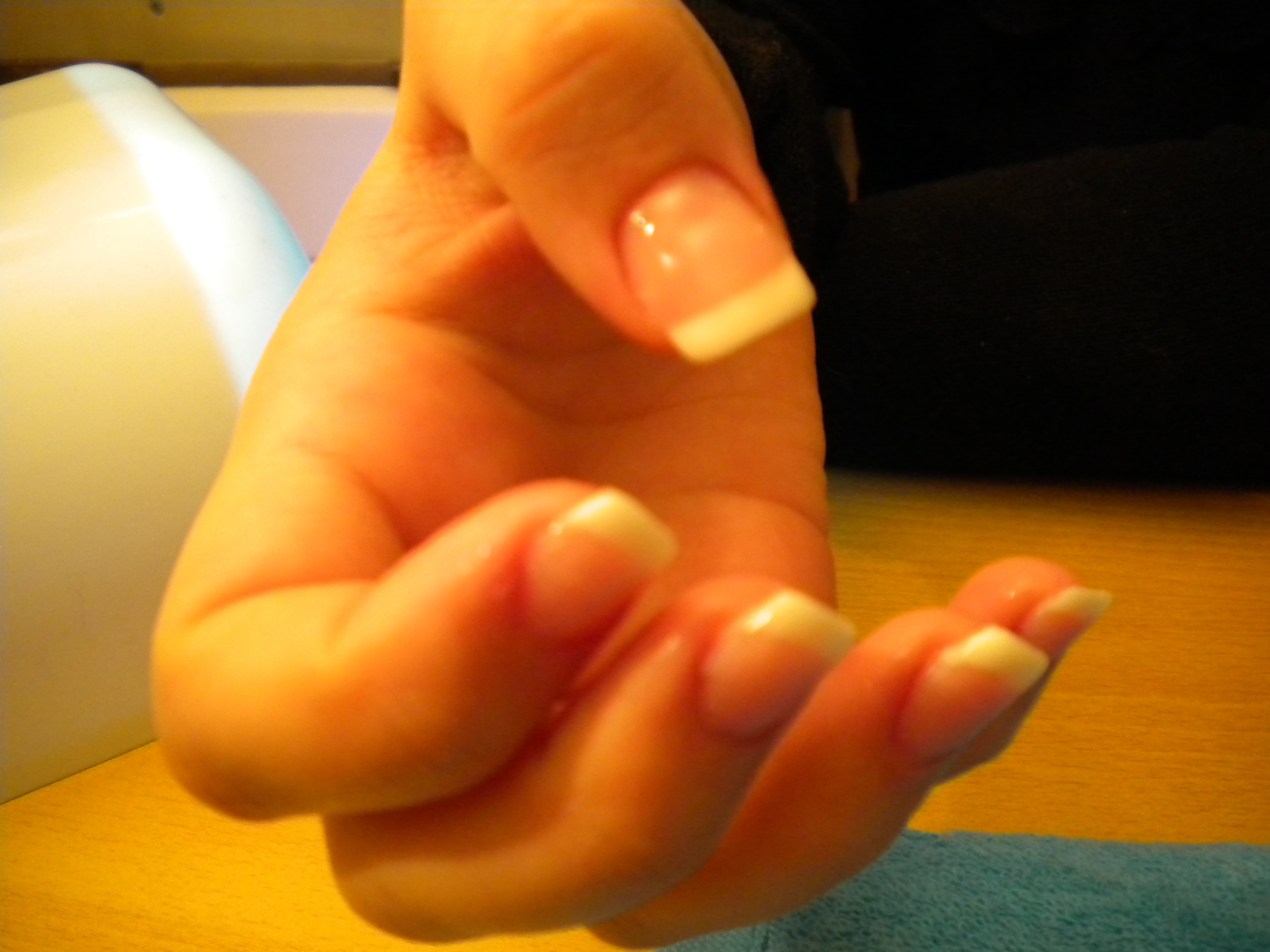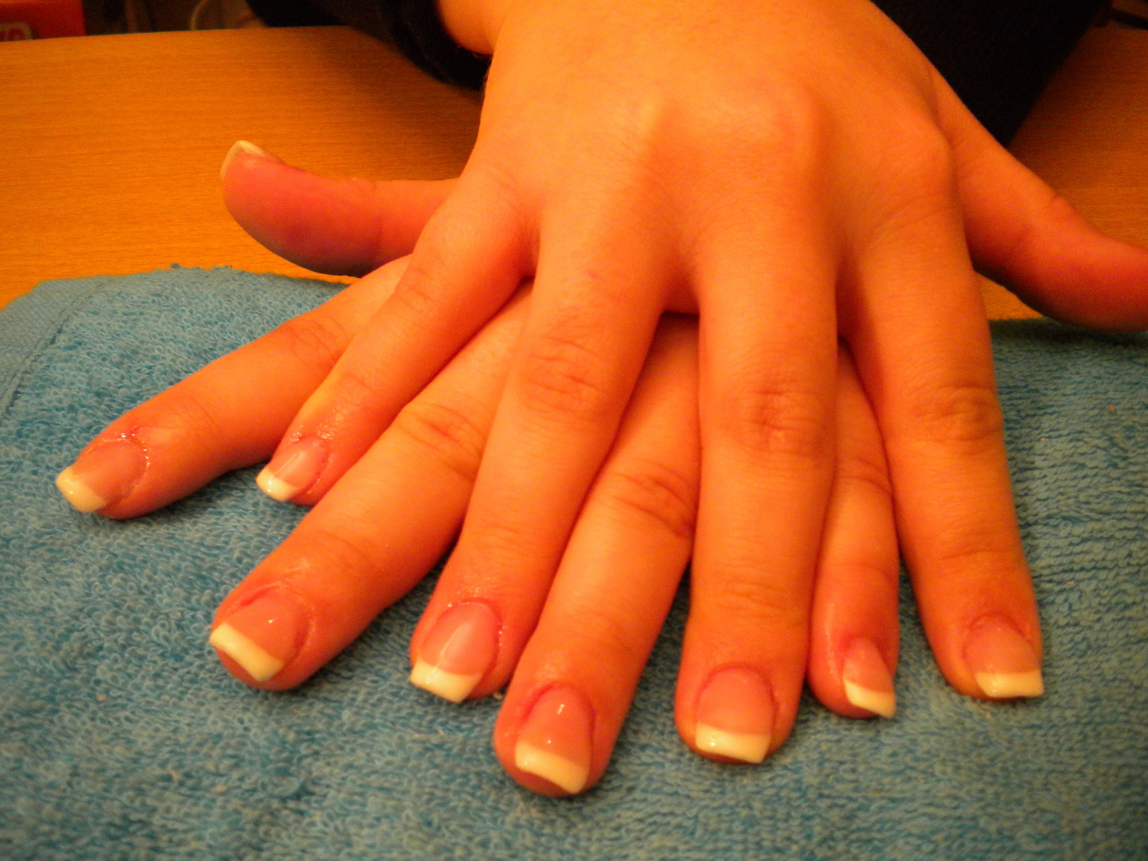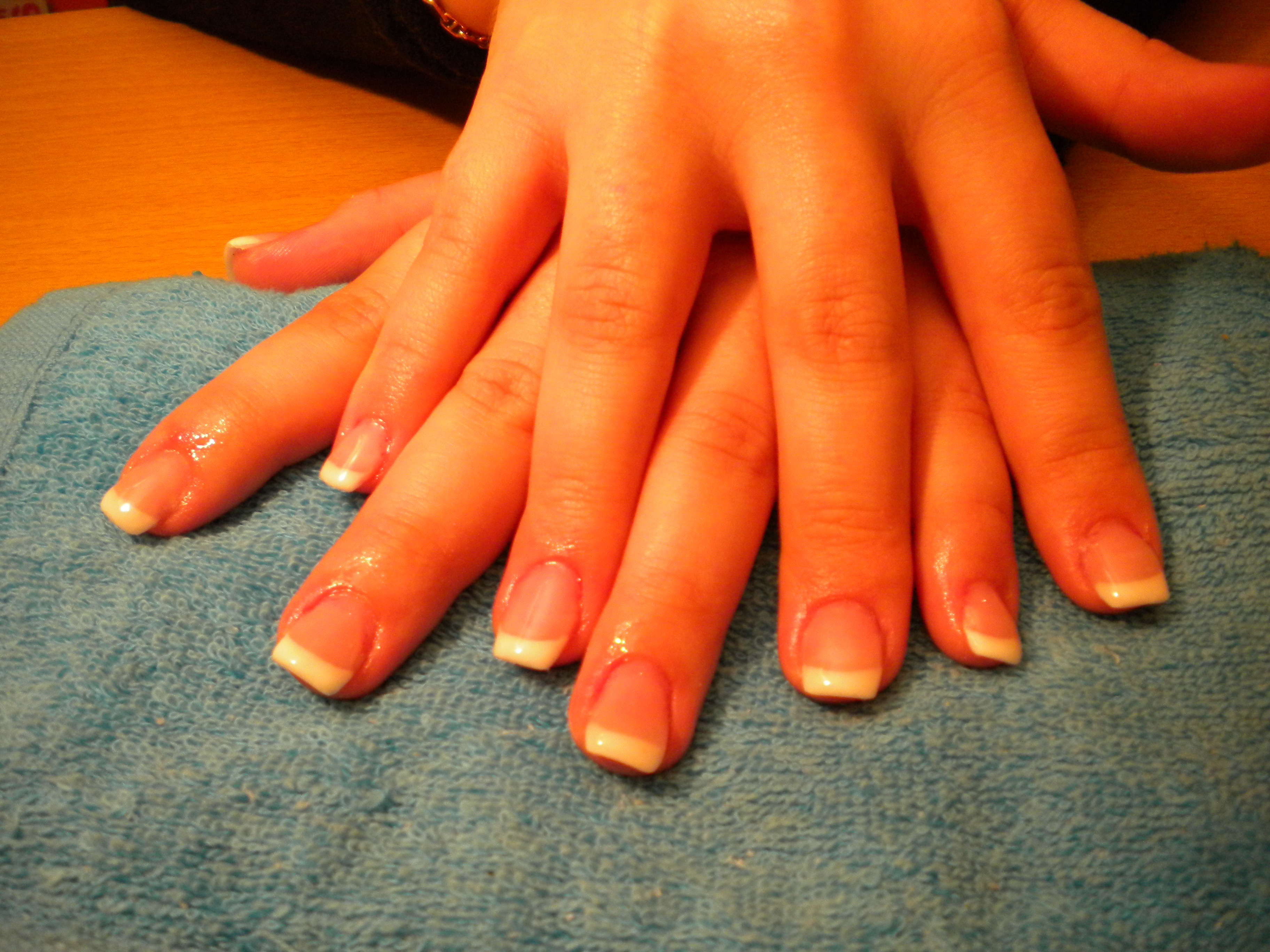 coucou voici ma derniere pose sur ma soeur qui me sert de modele mais que j'ai envie de tuer (met moi du gel meme dans les cuti, jveux une french bien droite aie ca fait mal....) Enfin bref voila ce que j'ai reussi à faire je trouve que je m'en sort pas trop mal pour une fois sur elle meme si il y a plein de défaut (gel dans les cuti, manque de bombé sur certains doigts, french trop droite à mon gout et tous les ongles ne sont pas de la meme taille) M'enfin c'est que la deuxieme fois que je pose sur elle et elle est pas facile surtout qu'elle à les onfles plat!!!