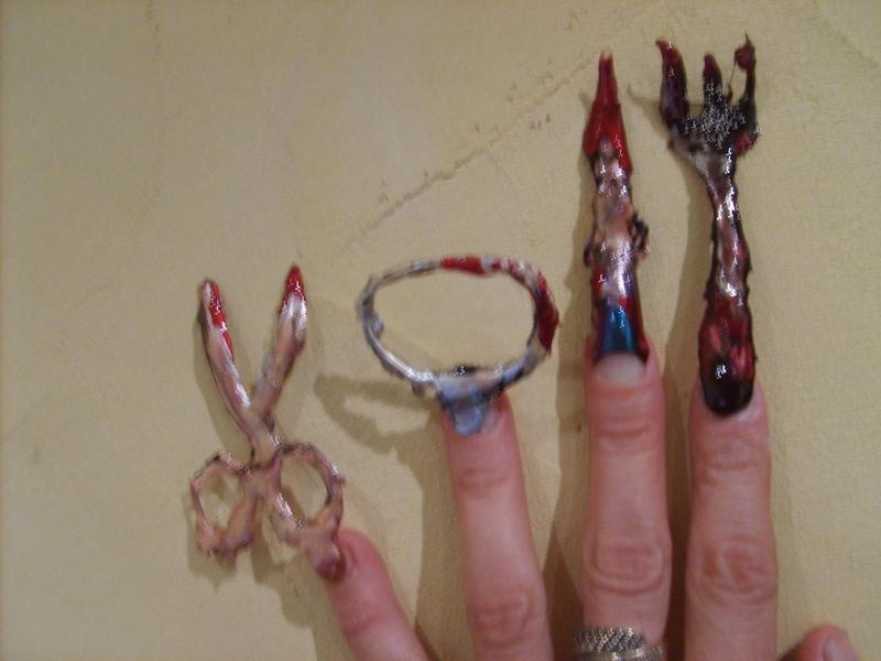 je dédie cette pose a capucine voila tout est fait en gel a mains lever et ensuite coller sur mes ongles ciseaux décapsuleur couteau fourchette