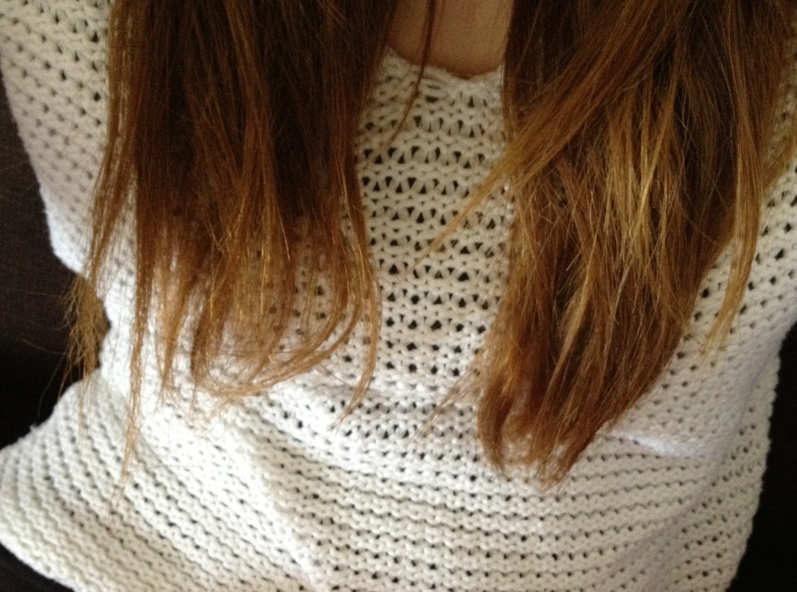Je vous mets en photo mes cheveux. La différence de longueur est flagrante... Dommage qu'on ne voit pas assez le côté secs/rêches/"brûlés" de la partie des cheveux à gauche sur la photo.