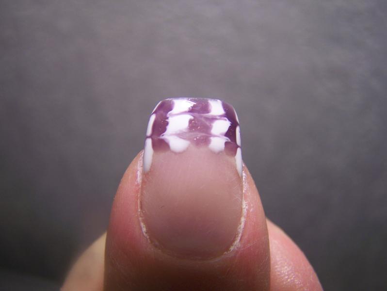 A oui en parlant de technique , sur le pas a pas , elle le faisait par bande et a l'aide d'un pinceau fin elle etirait son gel d'une bande a l'autre .