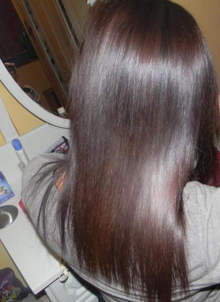 Je précise que ma soeur n'a pas des cheveux faciles!!! Elle a lavé ses cheveux sans soins, on a sèché vite fait au sèche cheveux sans brushing et ensuite passage des plaques