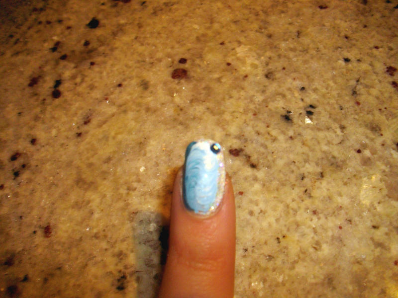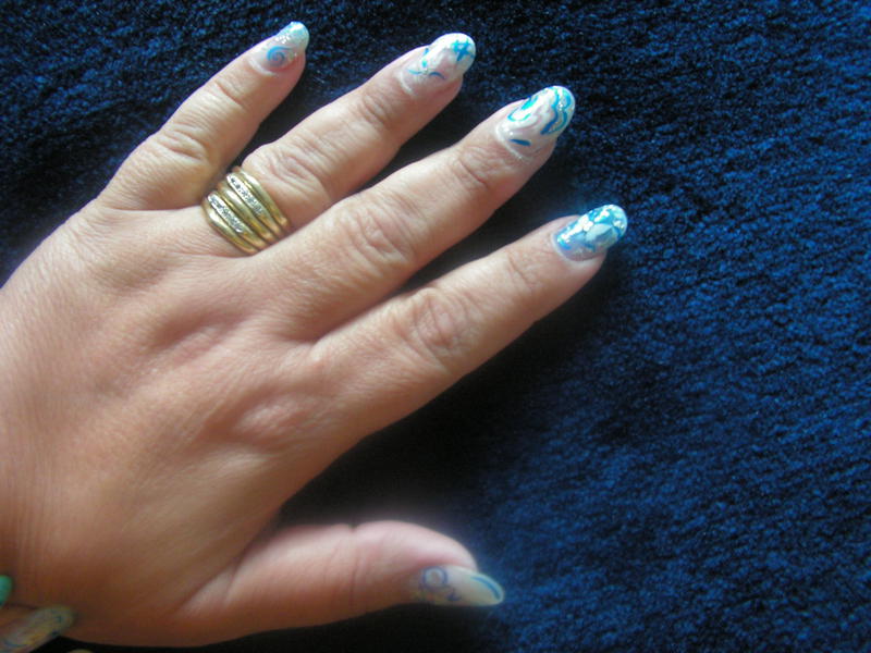 Suite à la demande d'une amie de lui poser du vernis pour sa soirée costumée, elle m'a demandé de lui "créer" une déco au vernis qui aille avec son costume : une sirène!