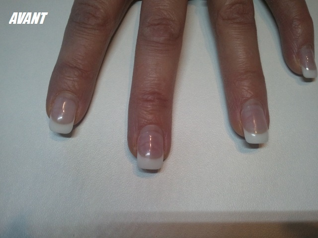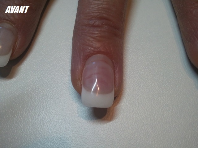 Elle va voir une PO depuis un an, donc fait des remplissages, au niveau de la pose ben il y a des défauts je le savais déjà, mais quand j'ai poncé, horreur, il y avait de l'eau qui c'était infiltré entre l'ongle et le gel (sur tout les ongles), par chance pas de champignons mais c'était vraiment sale entre les deux sur tout les contours et le bord libre, mais je n'ai pas pu tout enlever, car ces ongles étaient vraiment sensibilisés, ce qui se voit déjà avant le ponçage, mais pendant elle était assez sensible, donc j'ai éliminé tout ce que j'ai pu, et par dessus j'ai fait une pose avec un bombé pas trop gros pour avoir moins de limage le prochain coup pour éviter qu'elle est mal, par contre j'ai utilisé ma magic powder pour que se soit le plus solide possible. je vous ai mis les photos avant et après.