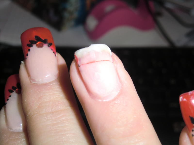 C'est ce que j'ai fait il y a 2 semaines, mon ongle s'était fissuré sur le coté tout en haut vers les cutis (aie, oui c'est mon problème je ne mets pas assez de matière sur les cotés...). Maintenant, ça pousse gentillement sous la résine... (et j'ai mis plus de matière cette fois-ci...)