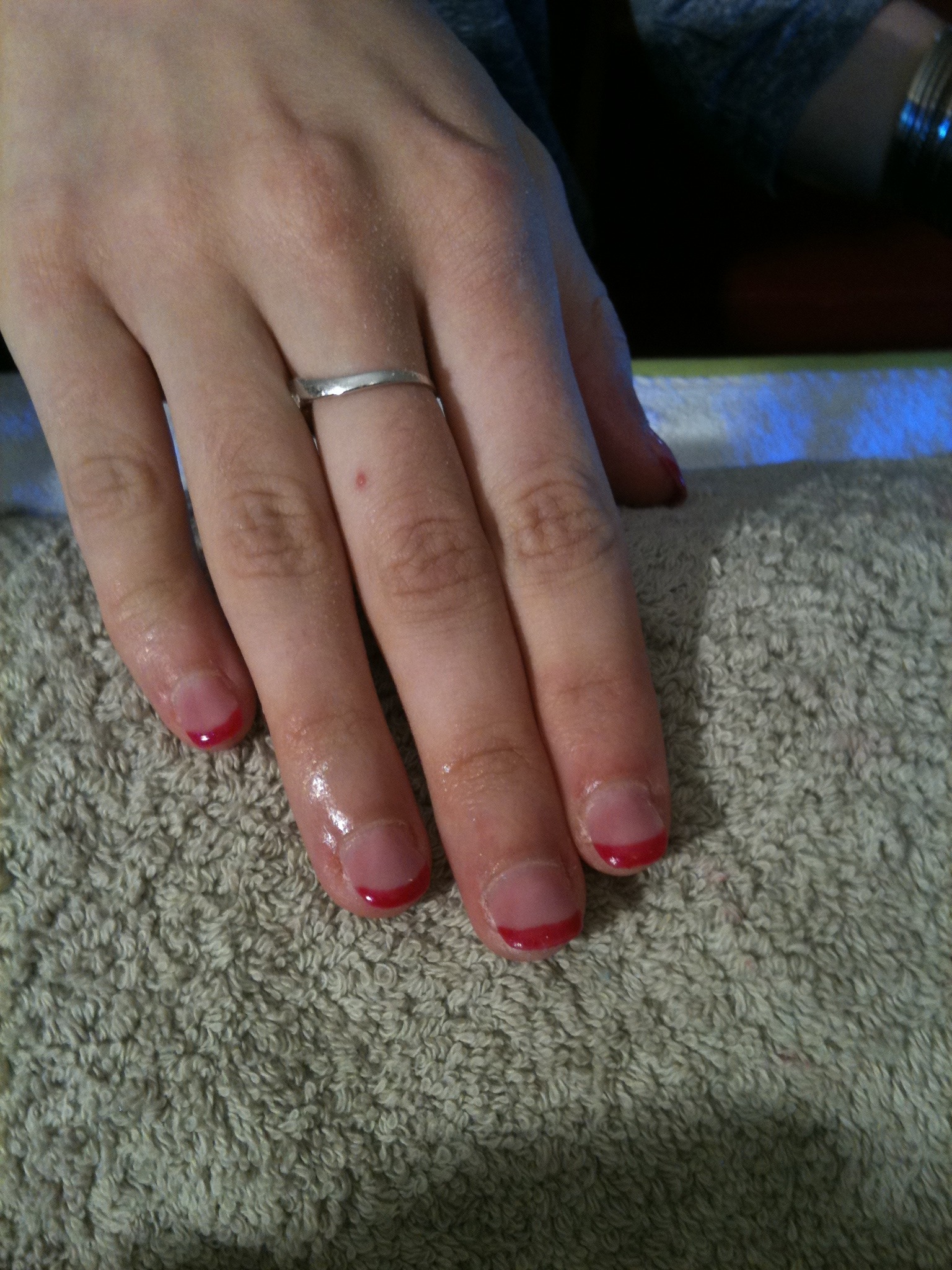 alors voila une pose realiser sur ongles court, ma cliente ne voulait pas de ralongement, voulait une french bien blanche et du bombé, car elle me dit que sens matiere elle casse ??