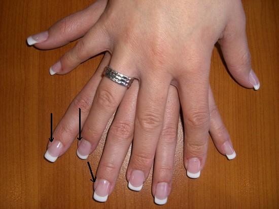 Regardez, j'ai montré par des flèches les endroits où on voit des "creux". En fait je met une boule de gel et je dois avoir trop peur de m'approcher des cuticules et le boule reste sur le milieu de l'ongle.