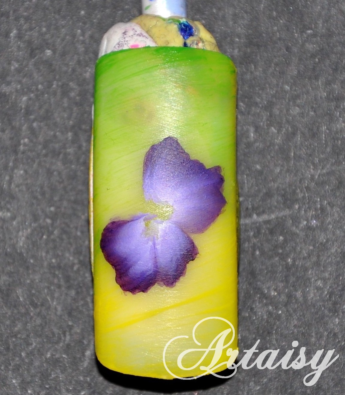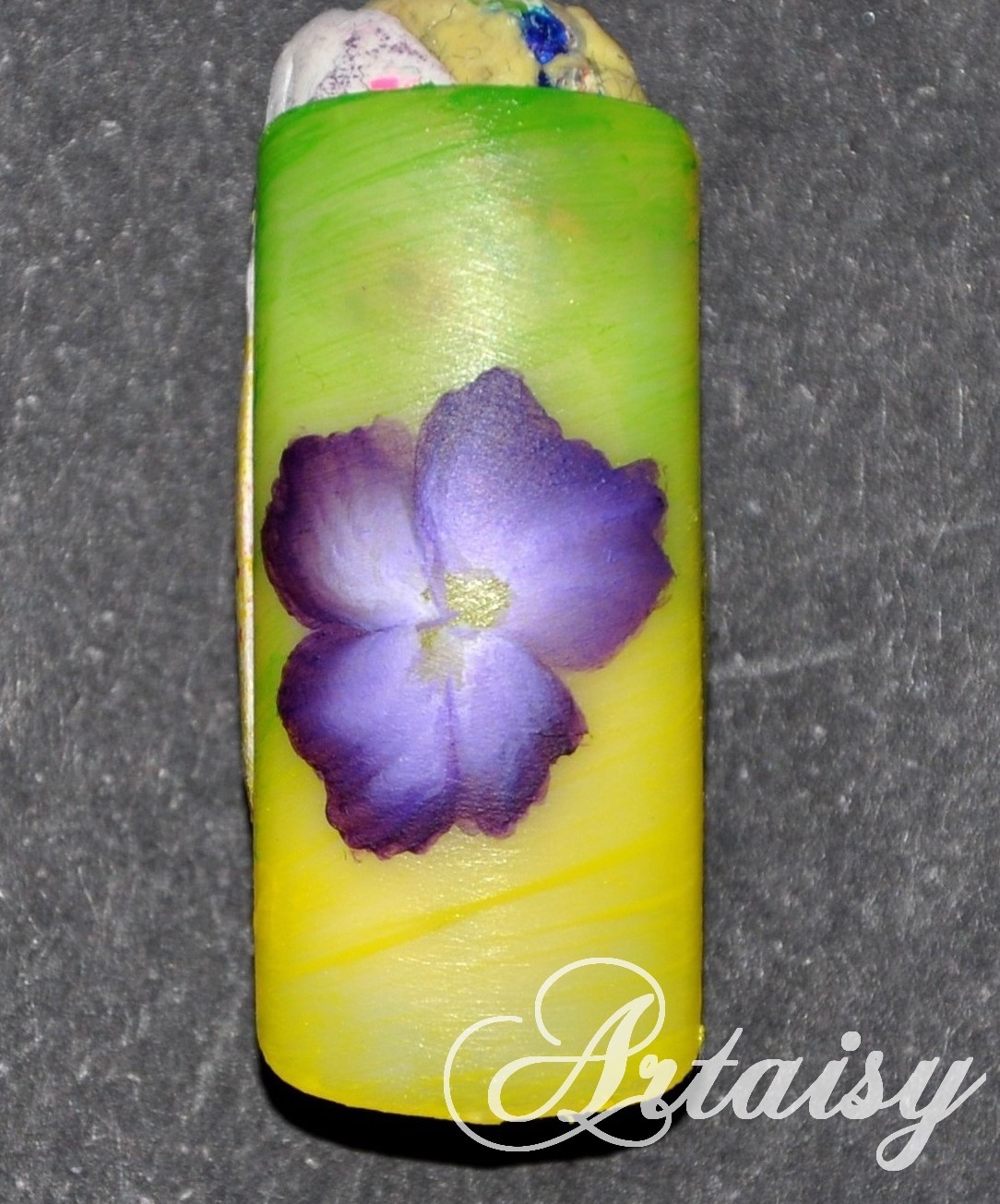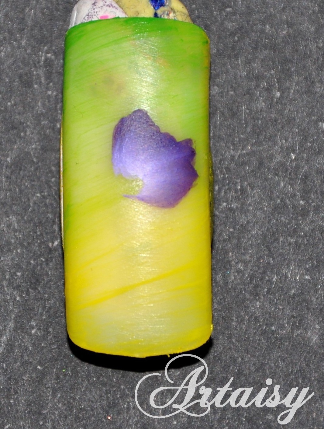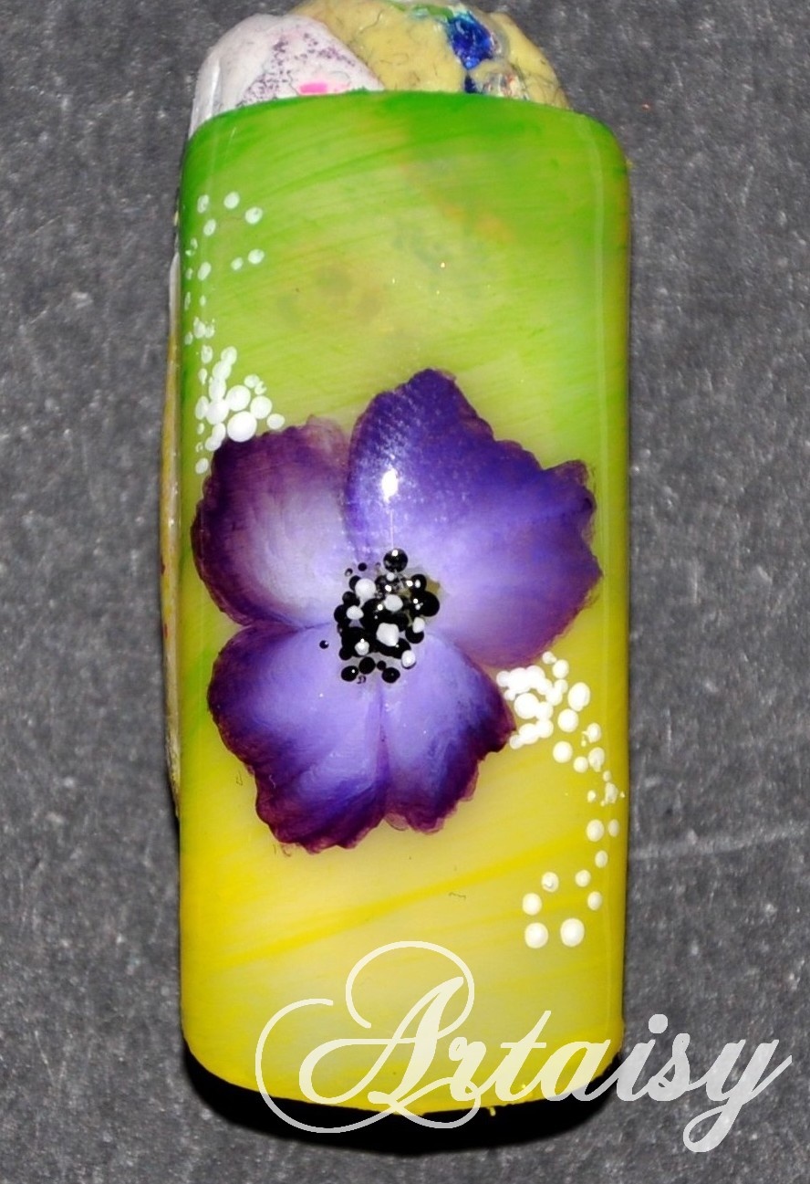 Sur cette photo on a 2 couleurs de peintures; blanc et violet foncé, ainsi que des points fait au dotting tool blanc et noir.