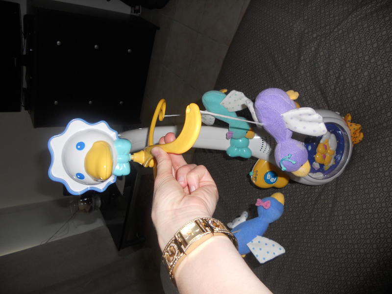 Lumi'mobile musical et parlant. Dès la naissance, pour endormir Bébé, des petites oies tournoient au son de 14 mélodies et des lumières sont projetées sur le plafond par la tête de l'oie.