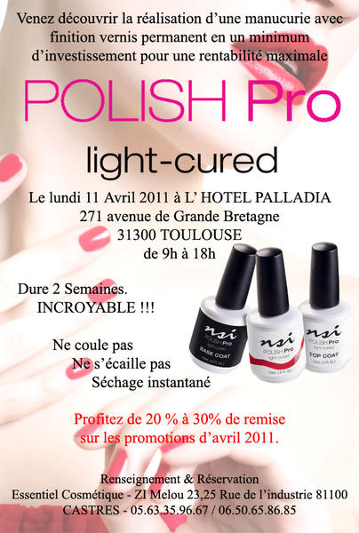 La marque américaine NSI (résine et gel) et la société ESSENTIEL COSMETIQUE organise le LUNDI 11 AVRIL 2011 à l'hôtel PALLADIA à TOULOUSE (31), une journée de démonstration de stylismes d'ongles en résine,résine couleurs, gels, nail art et vernis permanent (nouveautés).