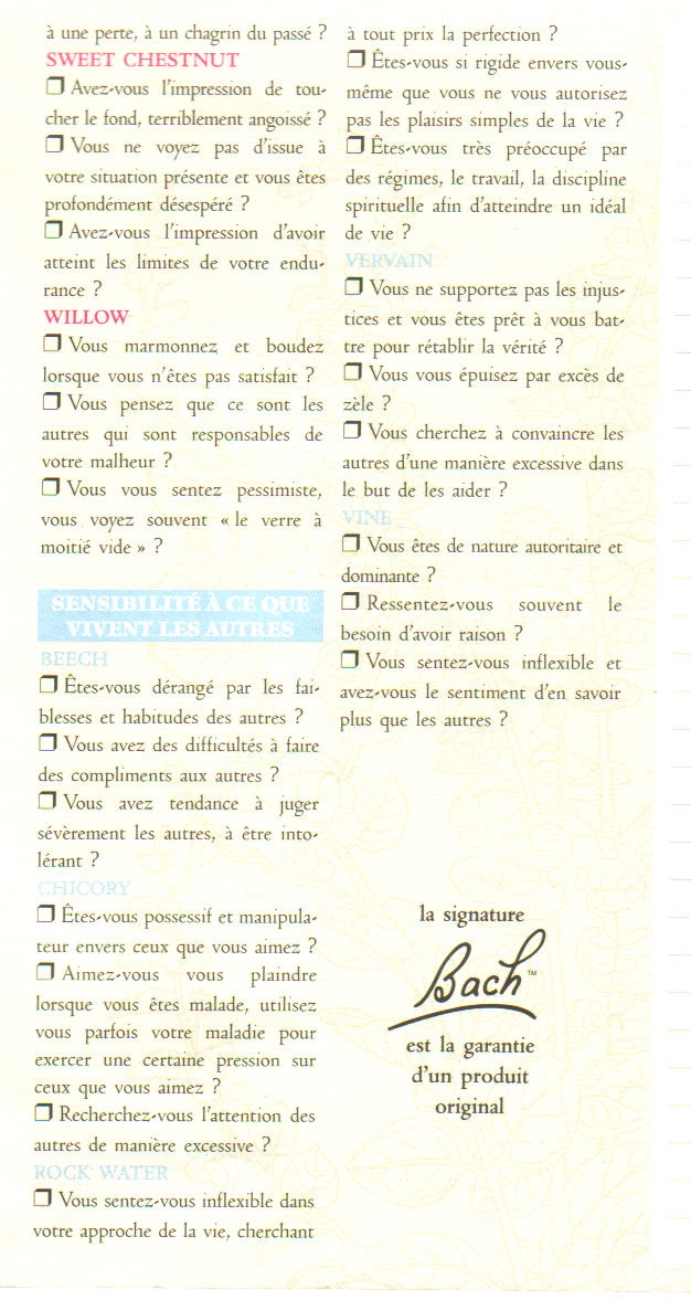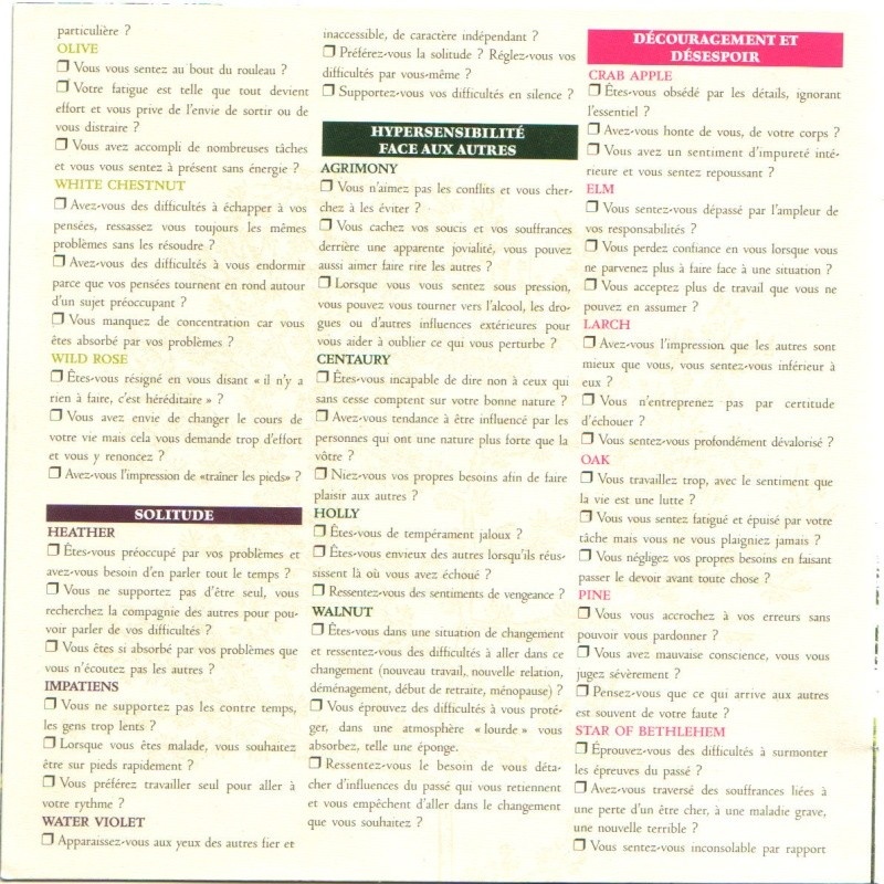 Et ensuite une ou deux autres fleurs de bach. Si tu en vois une interessante sur le questionnaire que je t'ai mis tu regarde sur internet quelles sont ses propriétés si ça à l'air de convenir !