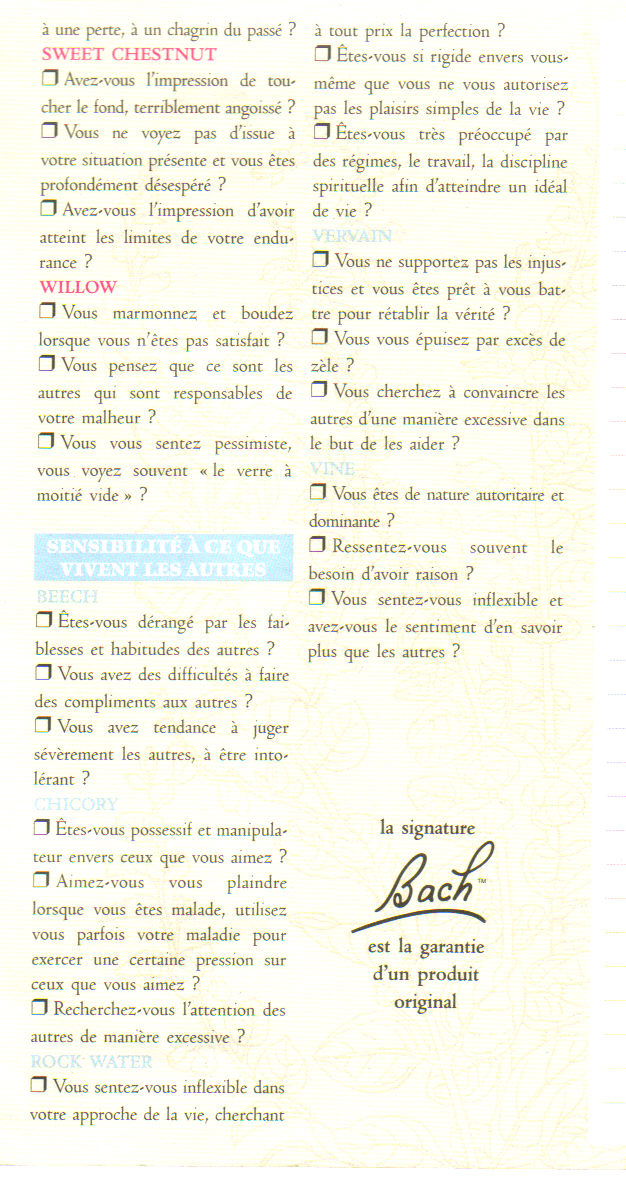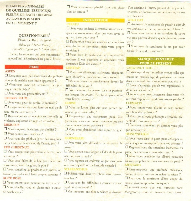 tu peux en trouver dans certaines pharmacies c'est des essences de fleurs tu prends en goutes ça agit sur le moral je te joins le questionnaire ici sinon regarde un peu sur internet les avis sont trés bons moi ça m'à beaucoup aidé pour mes accouchements et mes grossesses je prennais mimulus pour les peurs définies, white chestnut pour le trop plein de pensées, impatient pour l'impatience et rescue ponctuellement en cas d'urgence et au jour J
