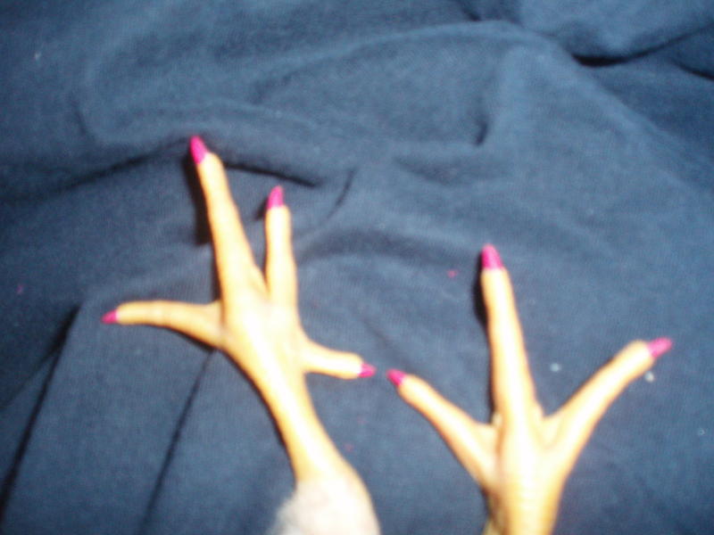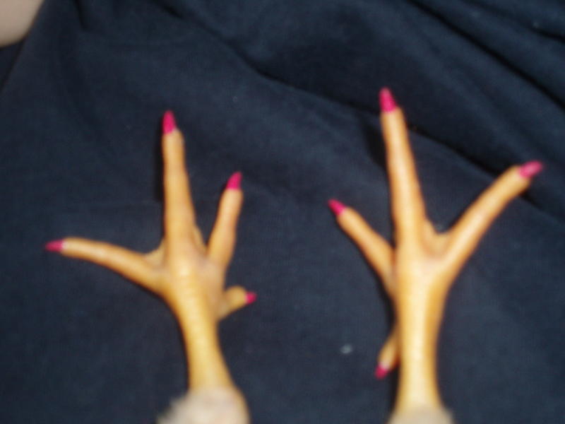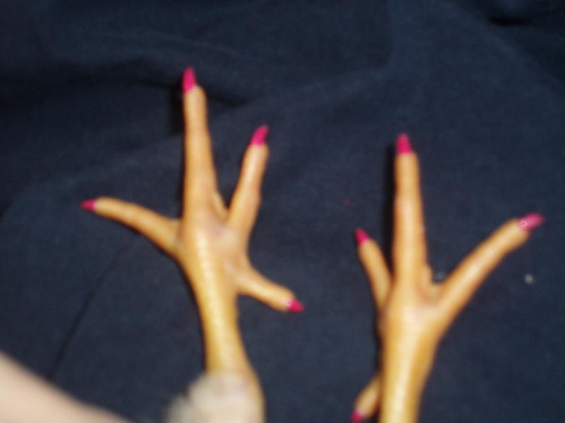 Jin m'a lancé le défi en quelques sortes, alors voici les ongles du poussin peints en rose(peinture à l'eau, je lui enlève aussitôt car j'ai peur que cela lui fasse du mal).