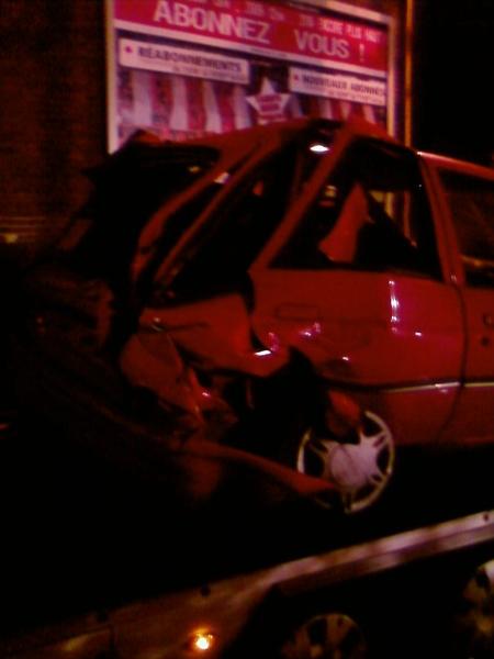 mardi soir est survenu un acci_dent terrible une voiture a embouti la mienne et ma facade de maison le moral n'est pas au beau fixe je n'es plus de voiture et le gars qui a fais ca est sorti ce matin de l'hopital s'est presente chez nous sans excuse (ben oui papa et maman ont debourse pour lui) je vous laisse mes fotos