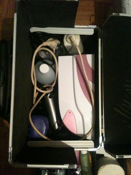 et dans le compartiment du bas j ai ma grosse bouteille de cleaner, mon gros stock de lime, ma multi prise, ma lampe, ma ponceuse et mon coussin repose mains.