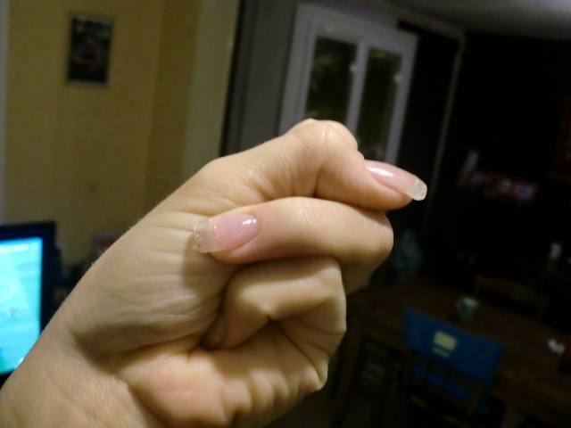 et voilà mes 2 doigts l'annuaire et le pouce, je sais pas si on voit bien , mais cest surtout sur le bombé que je veux vos avis, jai mis en frech un gel pailleté voilou merci les filles