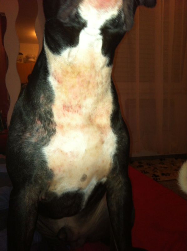 Pour les symptones il a pas bco de perte de poil, juste quand il se gratte mais si non le normal.. Mais il se gratte jusqu'au sang, au niveau du cou, derriere les oreilles, et euh comment expliquer au niveau des "aisselles" et des plaques rouges au niveau des "entre jambes" car la il se mordille et il y a peut c'est devenu aussi sur les yeux et au museau, tout rouge et il se gratte avc le museau contre la table ou ce qu'il trouve, il est souvent tres tres chaud et depuis peu je remarque aussi qu'il manque d'energie il dort bco car dans la rue il en as de l'energie!! Et une chose que je comprend pas c'est que la nuit il dort tranquille il y a des nuit ou il se gratte 1 ou 2 fois et d'autres pas du tout, et dans la mer l'ete il suffit d'une fois et il a plu rien, ne se gratte plu!