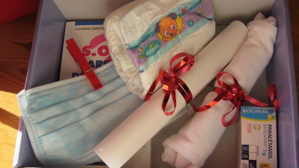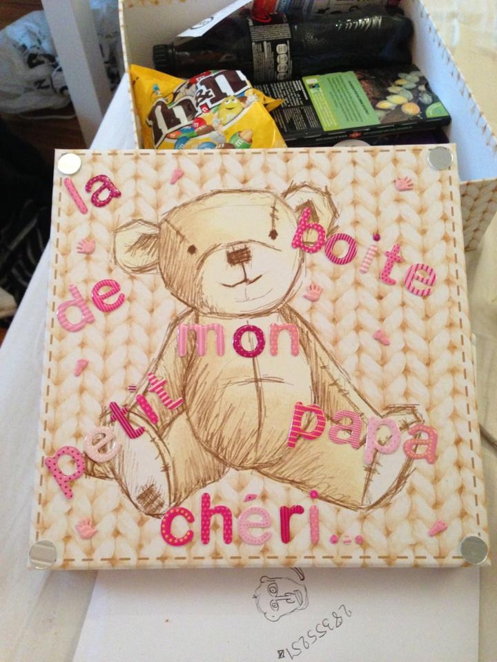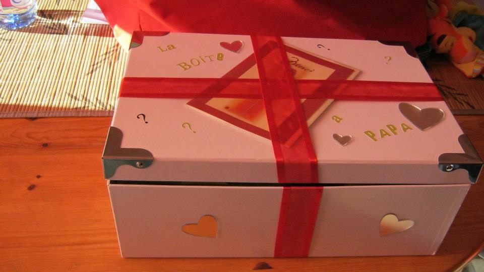 C'est une petite boite que l'ont donner au papa, moi vu que c'était une césa programmé, j'ai lui ai mis la boite sur notre lit avec sous l'oreille un petit cadre avec une photo de son fils en 3d et de moi enceinte avec un petit mot ont reviens vite