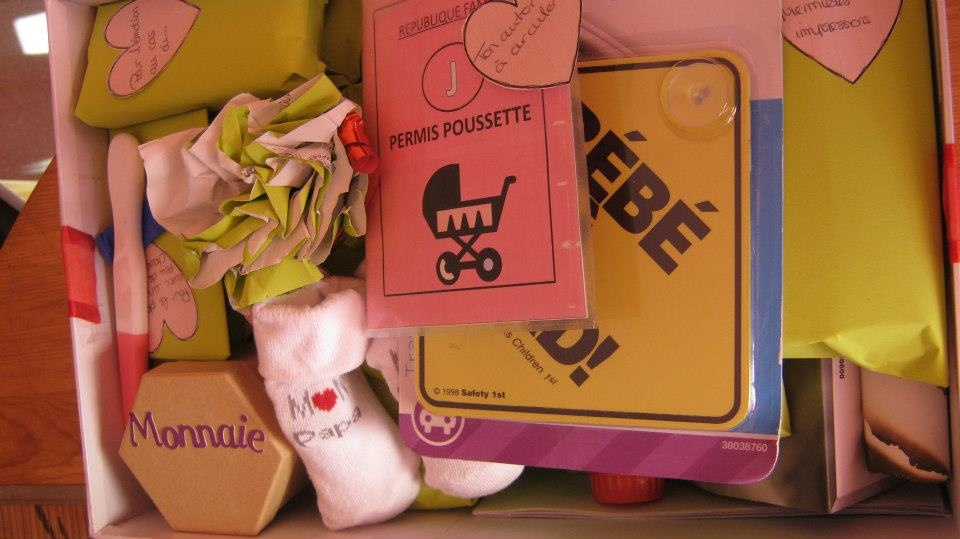 je ne sais plus qui l'a fait mais meme si je n'en ai pas fais j'ai trouvé que cetait une super idée!dans mes souvenirs les mamans y avaient mit un ptit message,des bonbons gateaux,un jeu vidéo,des magazines,BD,la liste des choses à faire,lol