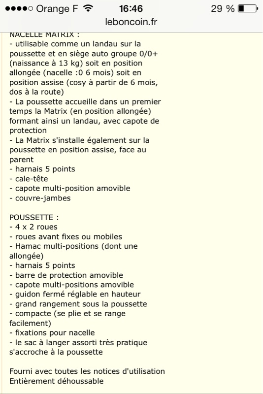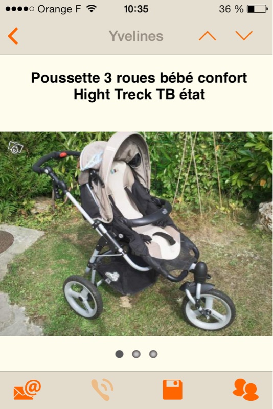 Poussette tout terrain Hight Trek (3 roues) marron très clair / beige TRES BON ETAT Idéal pour les bois mais aussi pour le sable grâce à ses grandes roues. - La poussette avec un châssis pliable et 3 roues qui s'enlèvent facilement pour prendre un minimum de place et son transat inclinable(3 positions), allongeable et réversible (face route ou dos à la route selon vos désirs) Ultra-maniable: commande centralisée roue avant : fixe ou pivotante et frein ralentisseur Permet les activités telles que le roller, la course à pieds. Guidon ergonomique réglable en hauteur Amortisseur de choc à l'avant et suspensions à l'arrière Grandes roues gonflables pour tous les terrains Dimensions ouvertes : L 120 x l 65 x h 94 à 106 cm Dimensions fermés avec roues : L 103 x l 65 x h 49 cm Dimensions fermé sans roues : L 81 x l 52 x h 40 cm Poids : 13 kg Tu en penses quoi Amand ? Elle est a 140€ sur le bon coin