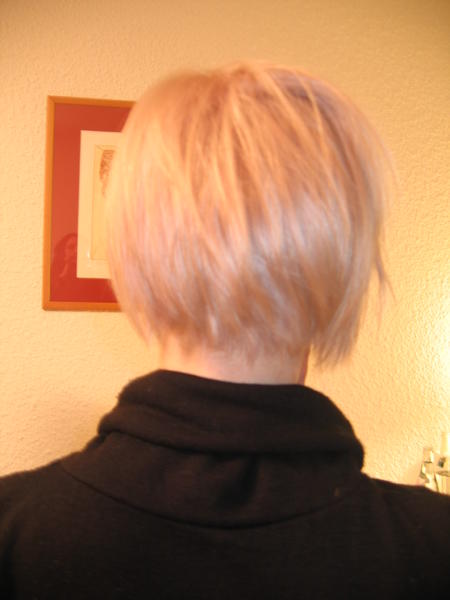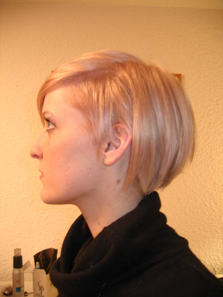 La dernière est appelé carré plongeant platine pastellisé rose. Avec plus de coupe sur les coté de la tête. Elle est "personalisé" car elle a été faite lors d'un show coiffure à Limoges avec WELLA. On nous paye pour servir de modèle, donc pour peu qu'on accepte de changer de tête (coupe et couleur), c'est le bon plan.