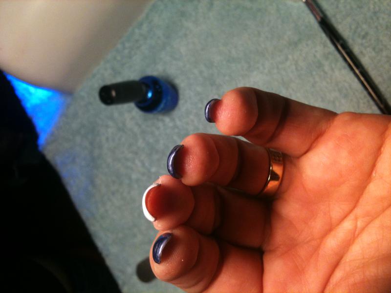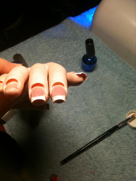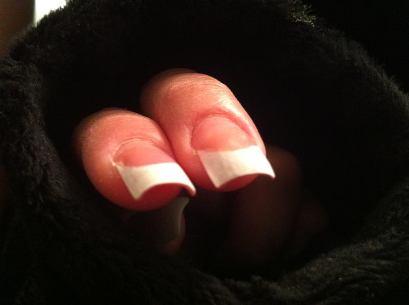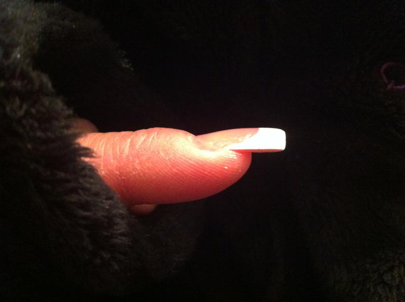 Voici mon index et majeur travaillés lors de cet après-midi avec le fameux gel Kodi qui se pinche.Un défi pour moi : réaliser la french au pinceau, il va falloir que je m'entraîne car ce n'est pas parfait et je n'ai pas l'habitude de faire des "dramatic" aussi prononcées mais j'y ai pris goût. Je n'ai pas mis de gel de base ou de primer mais aucun décollement de visible. Je montrerai l'évolution dans quelques jours. J'ai oublié de mettre de l'huile pour prendre la photo.