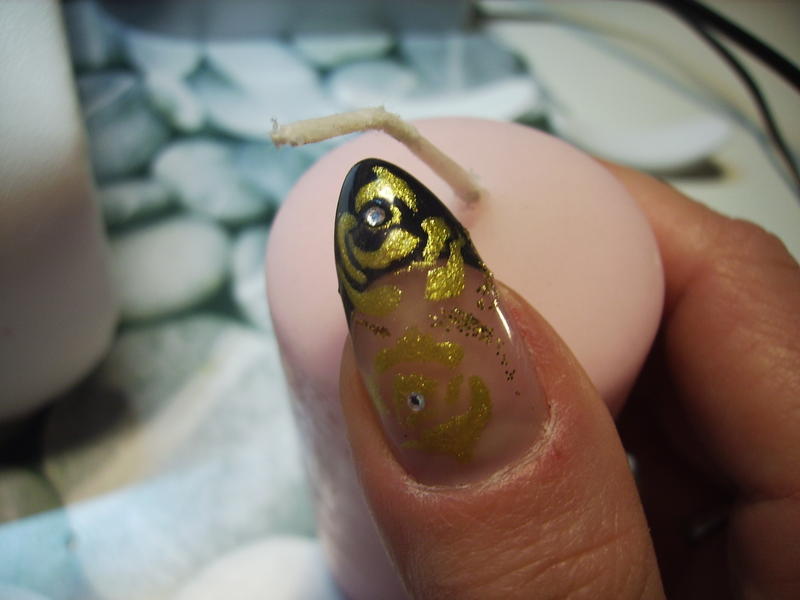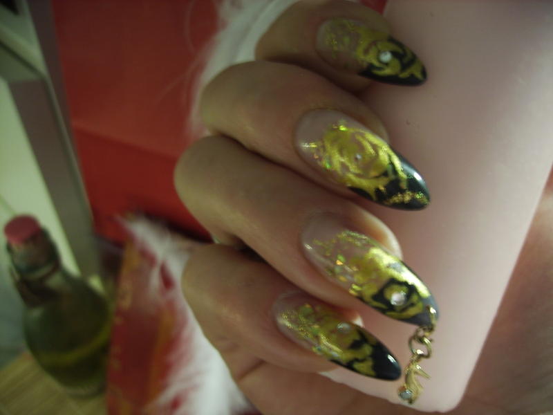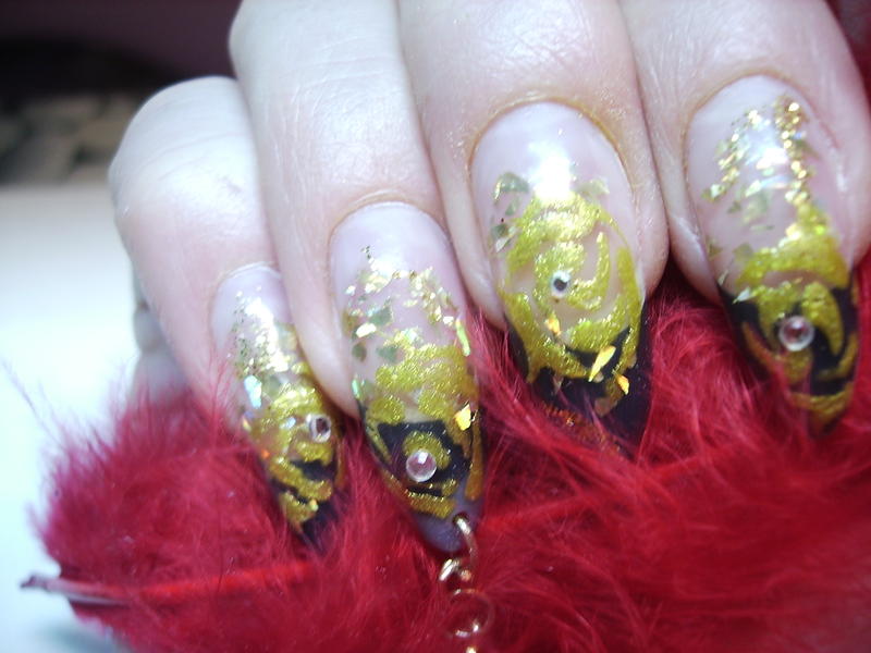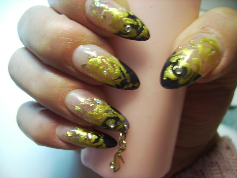 Bon.. remplissage de ma main droite avec deco au liner or + crusch or + strass + piercing talon aiguille pour aller avec la forme "mini stiletto"( ratée oui je sais .. )
