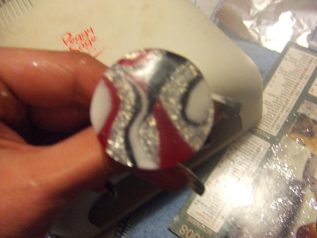 Angélique -> Pour les couleurs, j'ai travaillé à la Pébéo et au pinceau le noir, le rouge et le blanc. Puis gloss une fois les couleurs bien sèches puis avant de catalyser, j'ai mis mes paillettes argent
