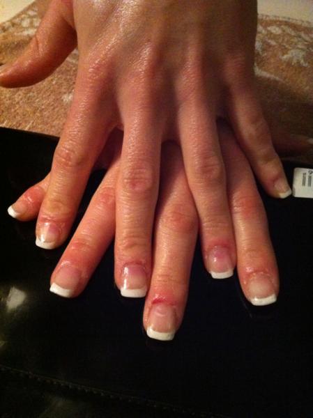 Plaques rouge tu as trop limer, utilise un gel mask pour cacher les marques blanches de c ongles. Manque un peu d'epaisseur. Bon entrainement