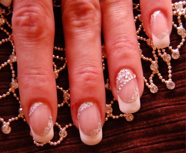j'ai fait un prolongement de plaque au nude d'AM, french, feuilles d'argent ( bien galere a poser d'ailleurs !!! lol) et quelques strass le tout construit et fini par l'unicum clear.