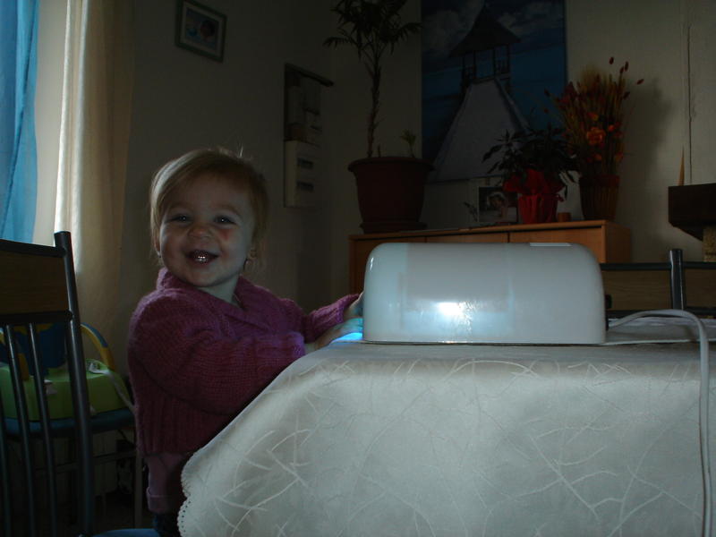 Elle me fait trop trop rire ! Et elle a compri comment on allumé la lampe, la chipie ! J'ai pas eu le temps de prendre la photo où elle se met la capsule lol. Meme Papa y a le droit