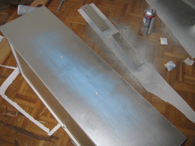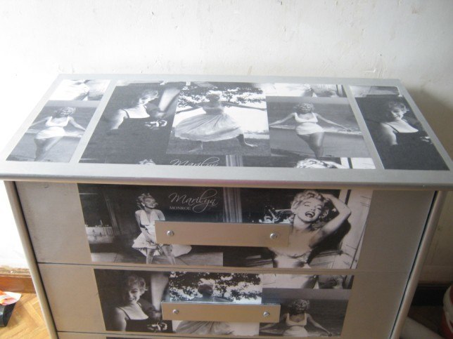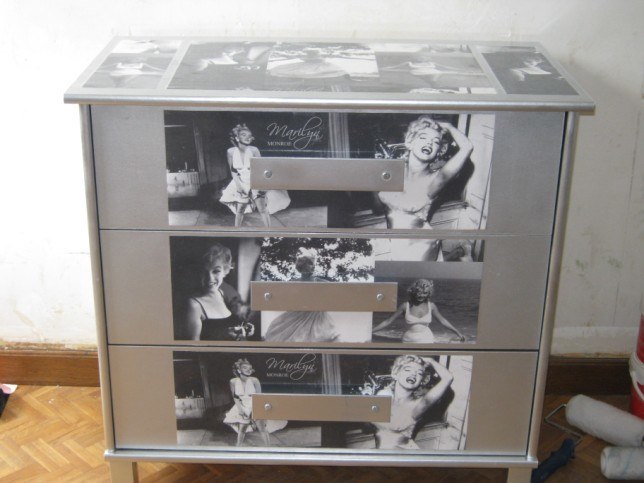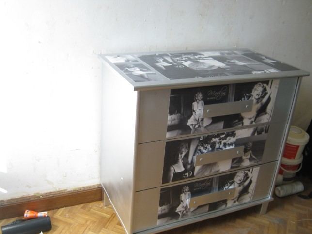 alors en fait d'abord la bombe grise,puis je colle des bandes de papiers peints sur le dessus et sur les tirroirs et ensuite j'ai recouvert entierement les tirroirs et e dessus de la commode au venilia transparent comme ça le papier peint est protégé!!!