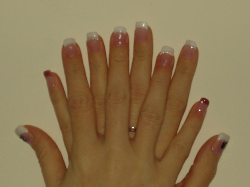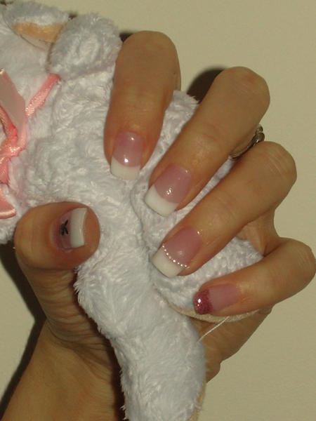 Voilà, je vous met la pose que j'ai faites sur moi même cet après midi ... J'ai fait assez simple, un play boy noir sur les pouces, une french rose paillettes sur l'auriculaire et des micro billes roses sur l'annulaire ( on voit pas hyper bien les déco ... ) ...