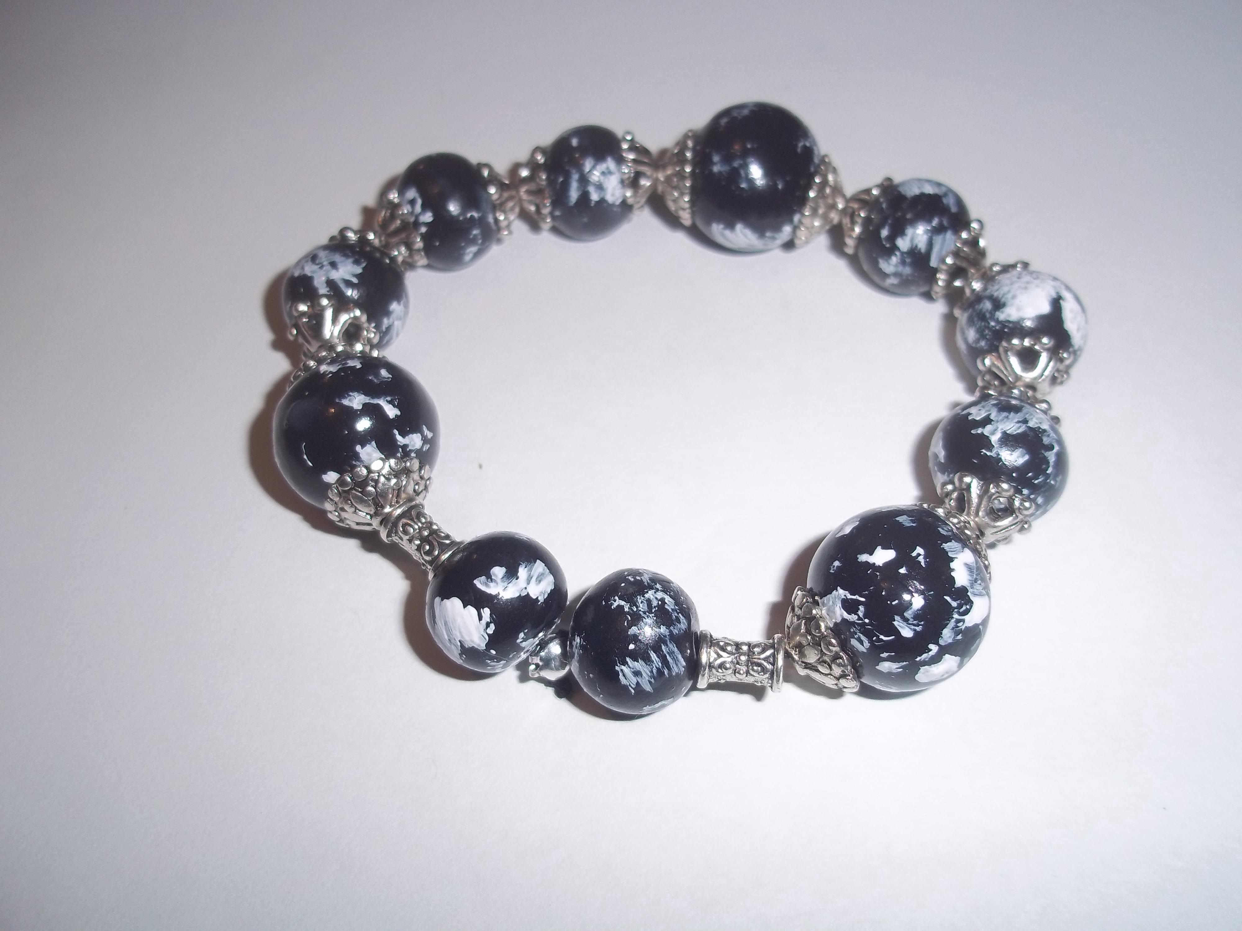 voici une nouveauté un bracelet avec caps argenté et perle noire tachetée blanche