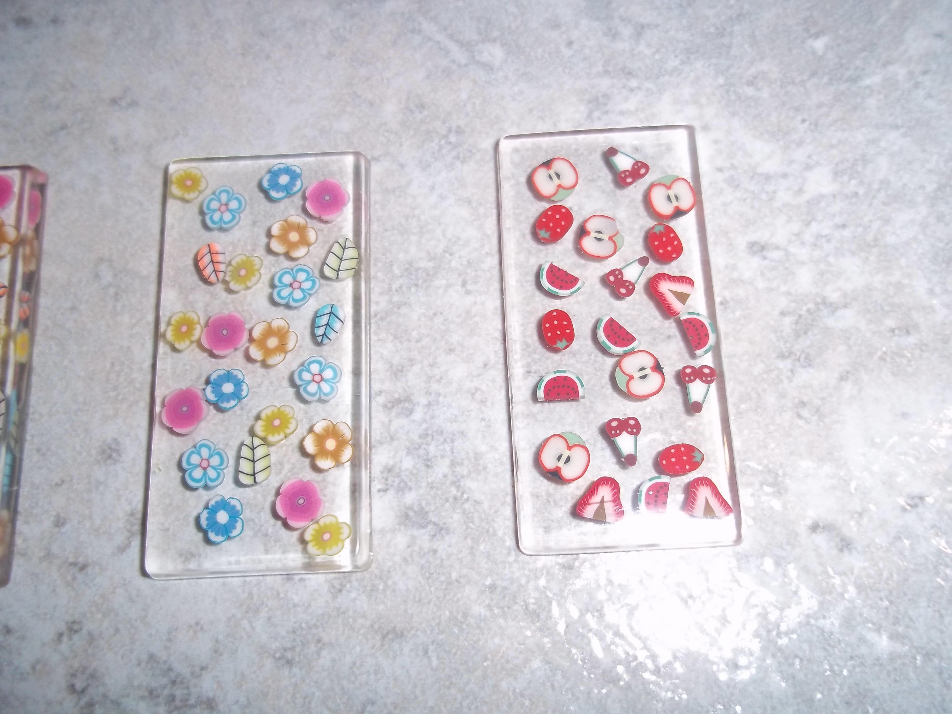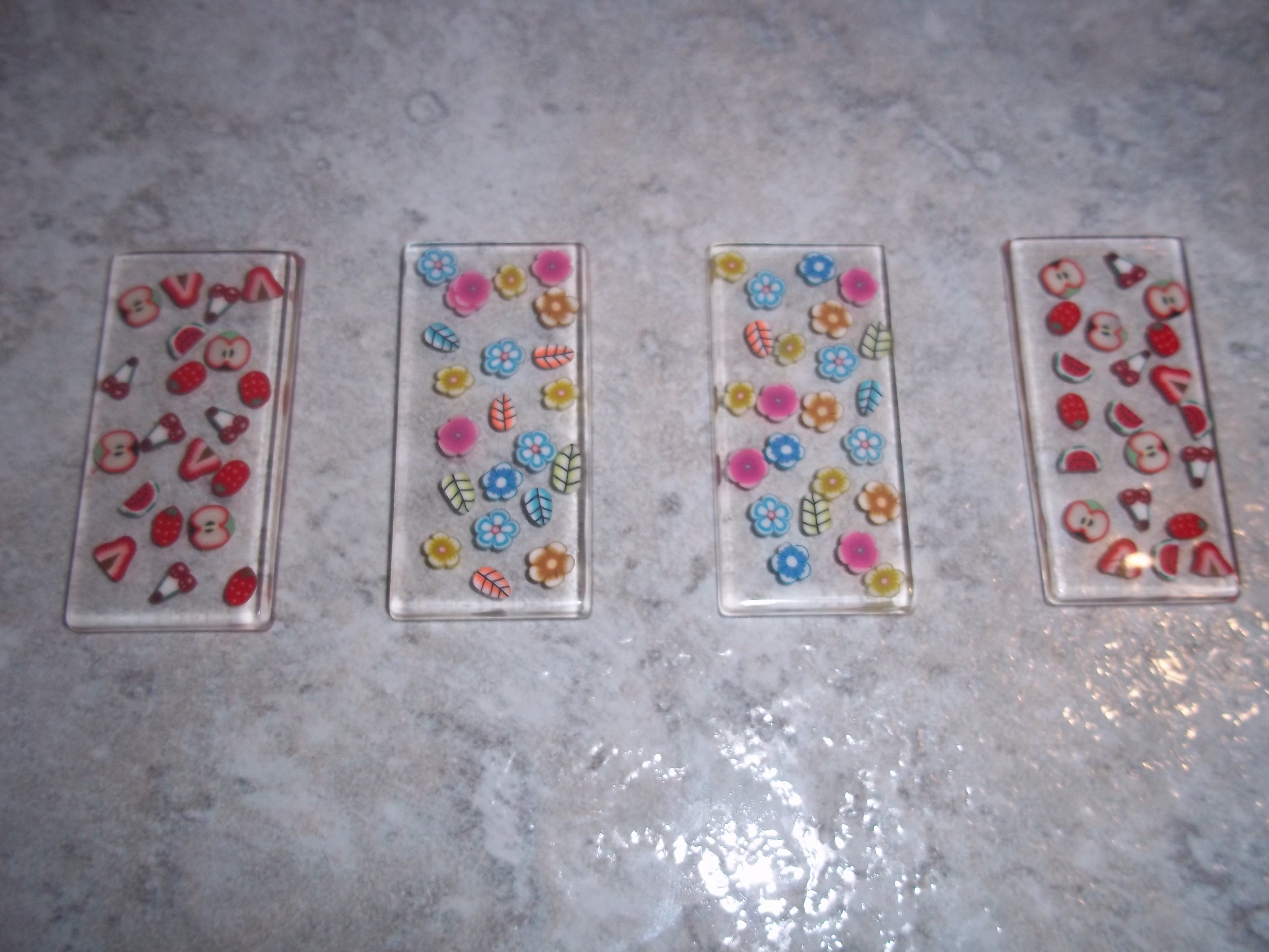 voici 4 plaques de resine avec incrustation qui une fois percée seront de sympa porte clefs et bijoux de sac ;)