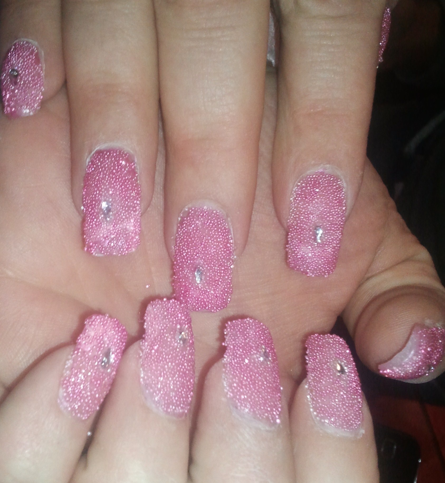 Voici ma toute première pose caviar au gel et microbilles transparentes surfacées en acrylique rose