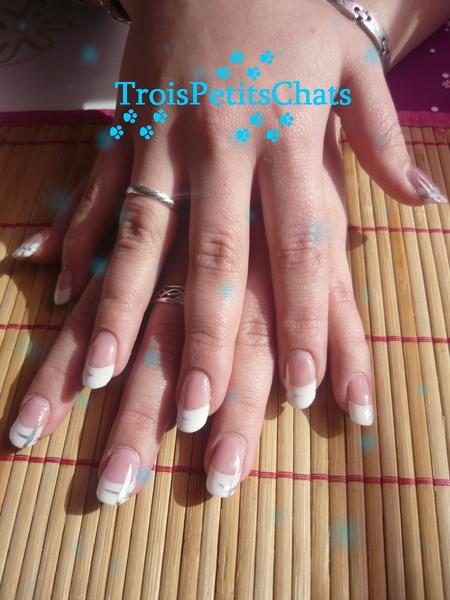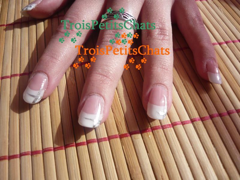 Capsules french, gel mask car 1 défaut sur un pouce (j'ai pas pensé à le prendre en photo, c'était une large tâche blanche dû à 1 écrasement de la matrice il y a plusieurs mois) et déco au liner argenté.