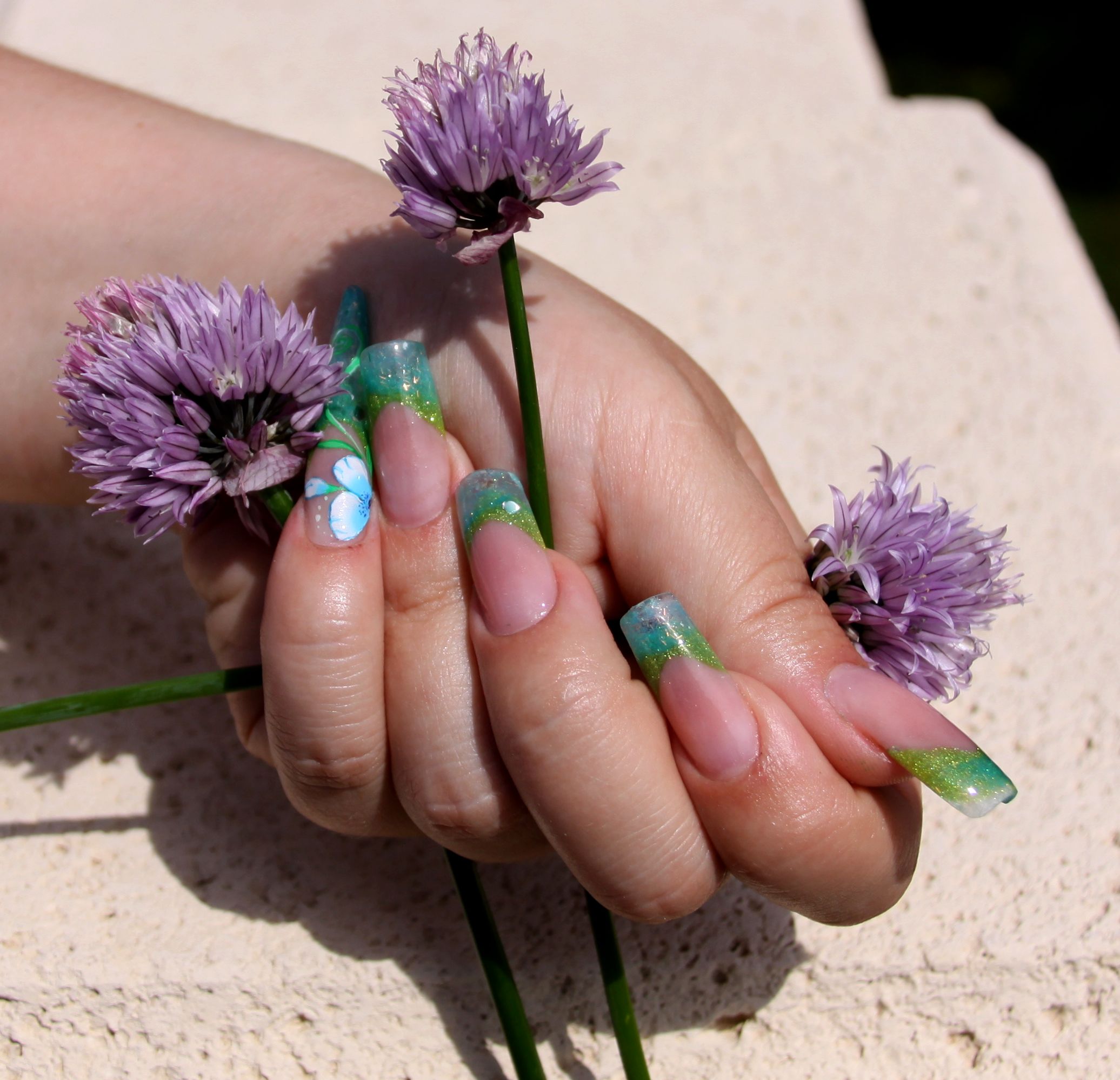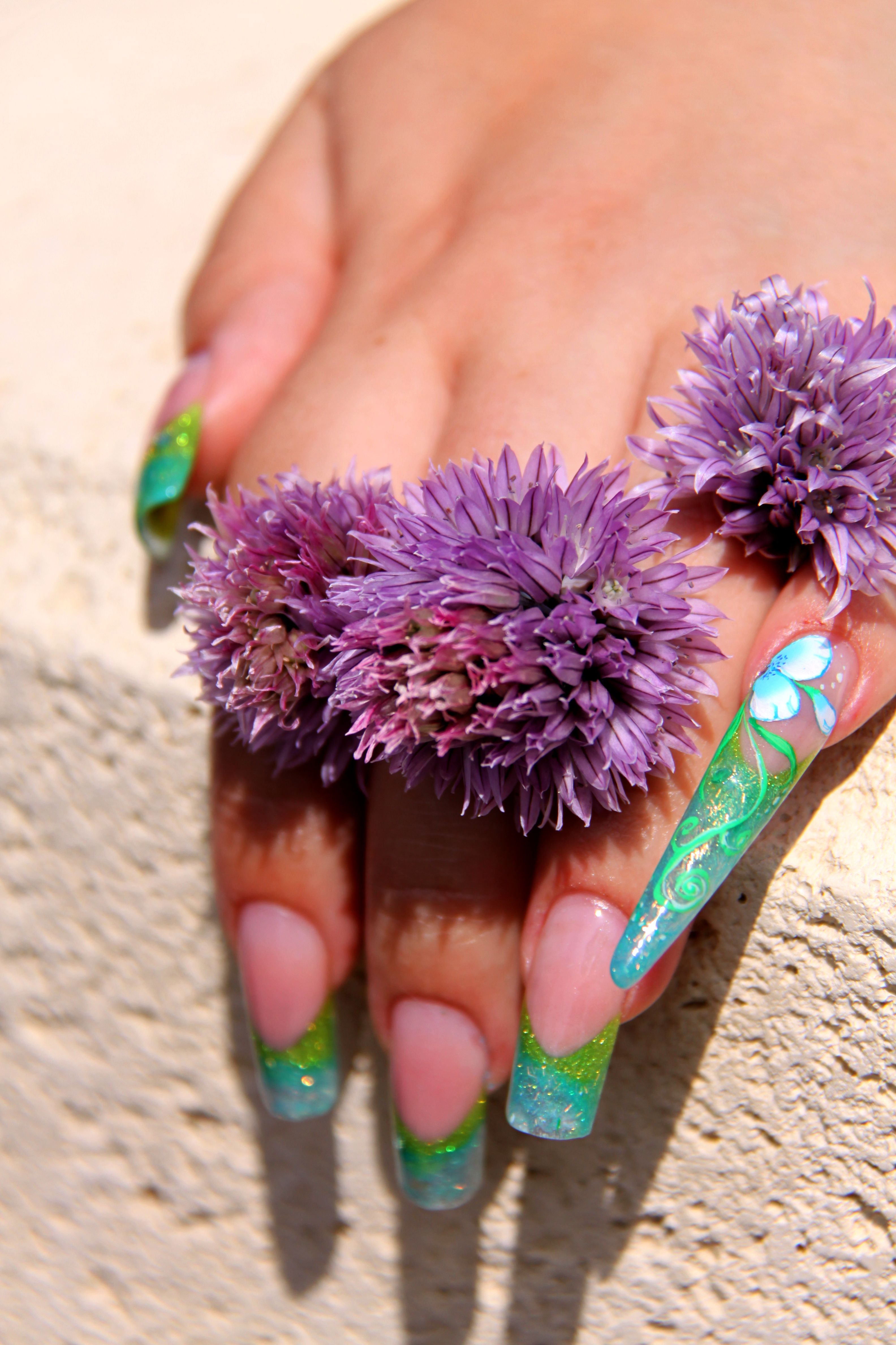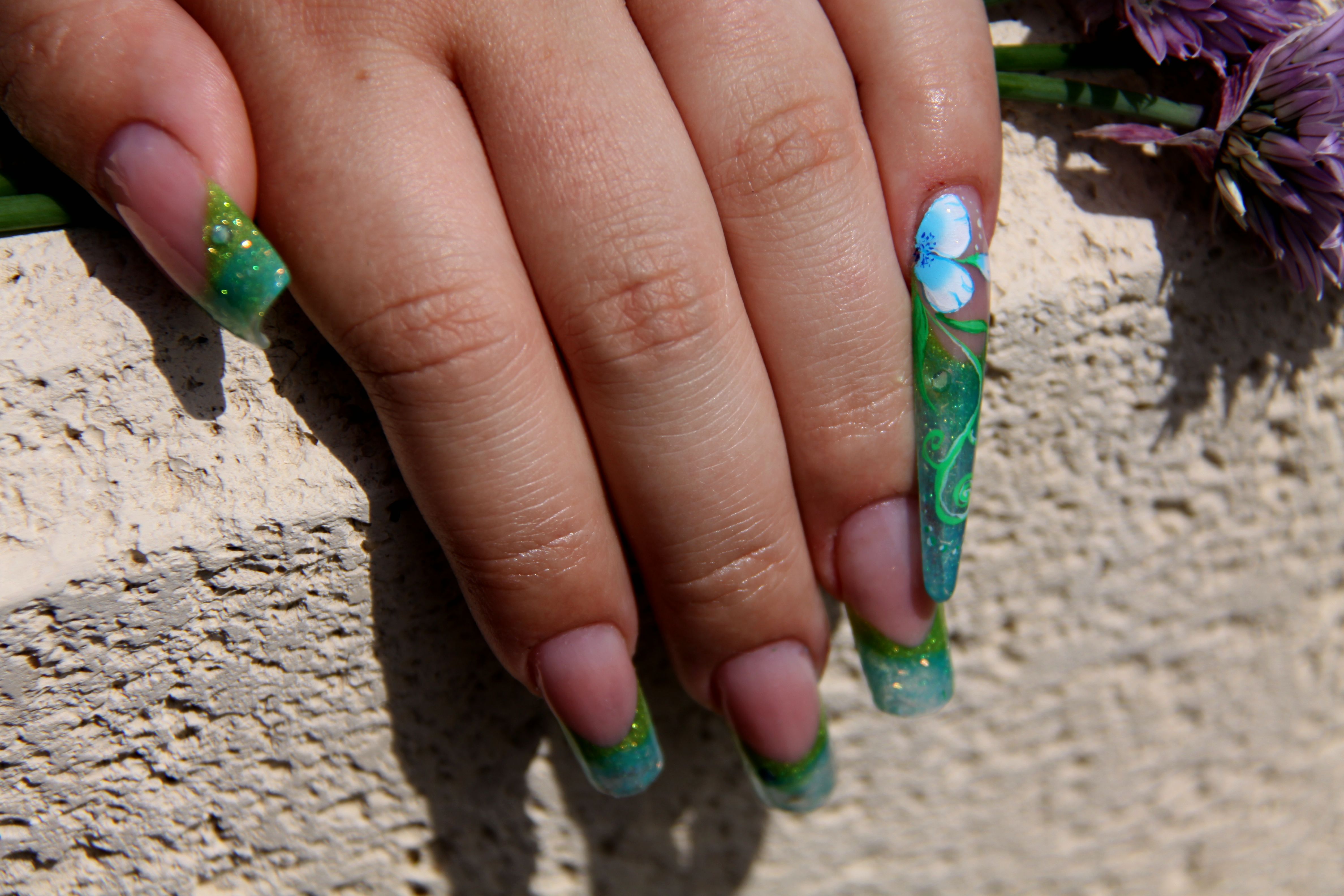 voilà ma pose de ce week end, french dégradée verte et bleu, kit bollywood de magnetic, masque cover pink magnetic, clear et blush pink magnetic. Stilletto sur petit doigt et petite déco one stroke. (je n'avais pas refais de stiletto depuis ma formation).A vos avis...............:)