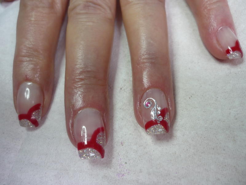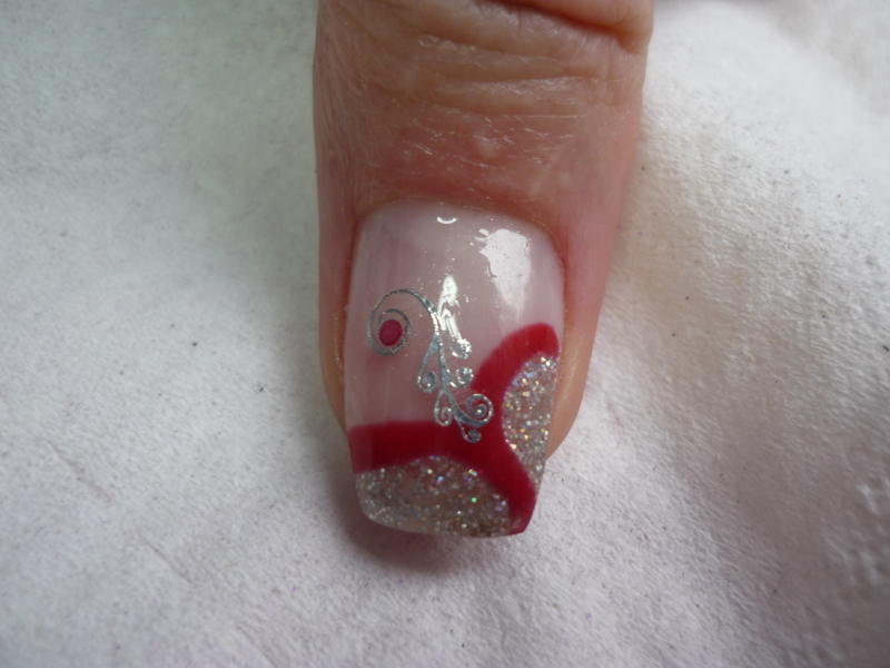 j'ai d'abord fait la partie argentée pailletée et au moment de vouloir faire le trait rouge en gel, au conact du gel argenté catalysé, le rouge a commençé à se '' diluer '' .