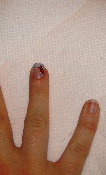 j'ai tester un doigt sur la main droite bon j'ai un peu galéré et pi j'ai aussi voulu utiliser des paillettes argenté, un tit strass et un pe de liner rouge pailletté mais bon c pas trop sa avec les paillettes j'ai voulu en mettre juste sur la french mais bon sa c étalé quand j'ai mis le gel enfin la cata koi lol si quelqu'un d'entre vous sais comment on fait avec des paillettes ??????????????