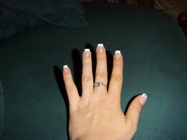 voila ! jai eu un souci avec mon index , malgres le mask sa na pas cacher les imperfection que j'ai au niveau de ma french naturel (je sais pas si vous voyai) elle est tres prononcer donc pour ne pas voir les defau jai descendu un peu la french donc plus grand ke les autres je trouve ! sinon j'ai pas mis de gel sur les cuticule donc pas de décolement a J+1 contrairement a ce que j'avais avec ma prothesiste !