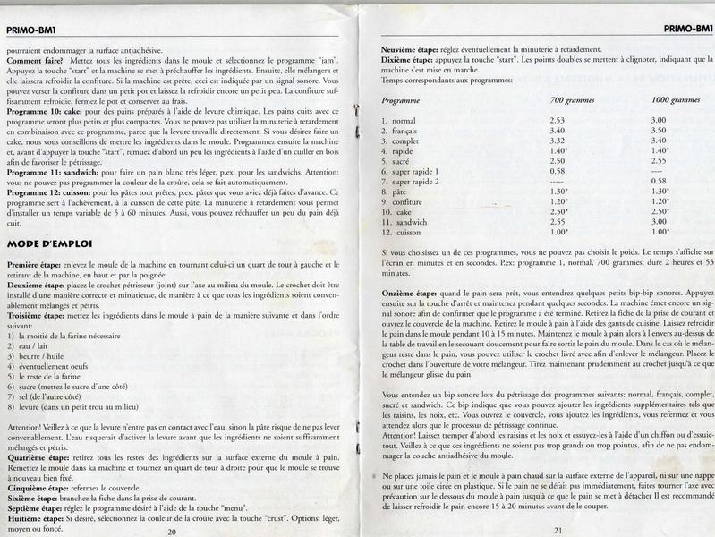est-ce que quelqu'un aurait le livret de recettes pour la machine a pain primo que j'ai acheté chez aldi (belgique) il y a environ 3 ans je n'arrive plus a remettre la main dessus je me suis très peu servi de ma machine et la je n'ai donc plus les recettes avec les proportions.