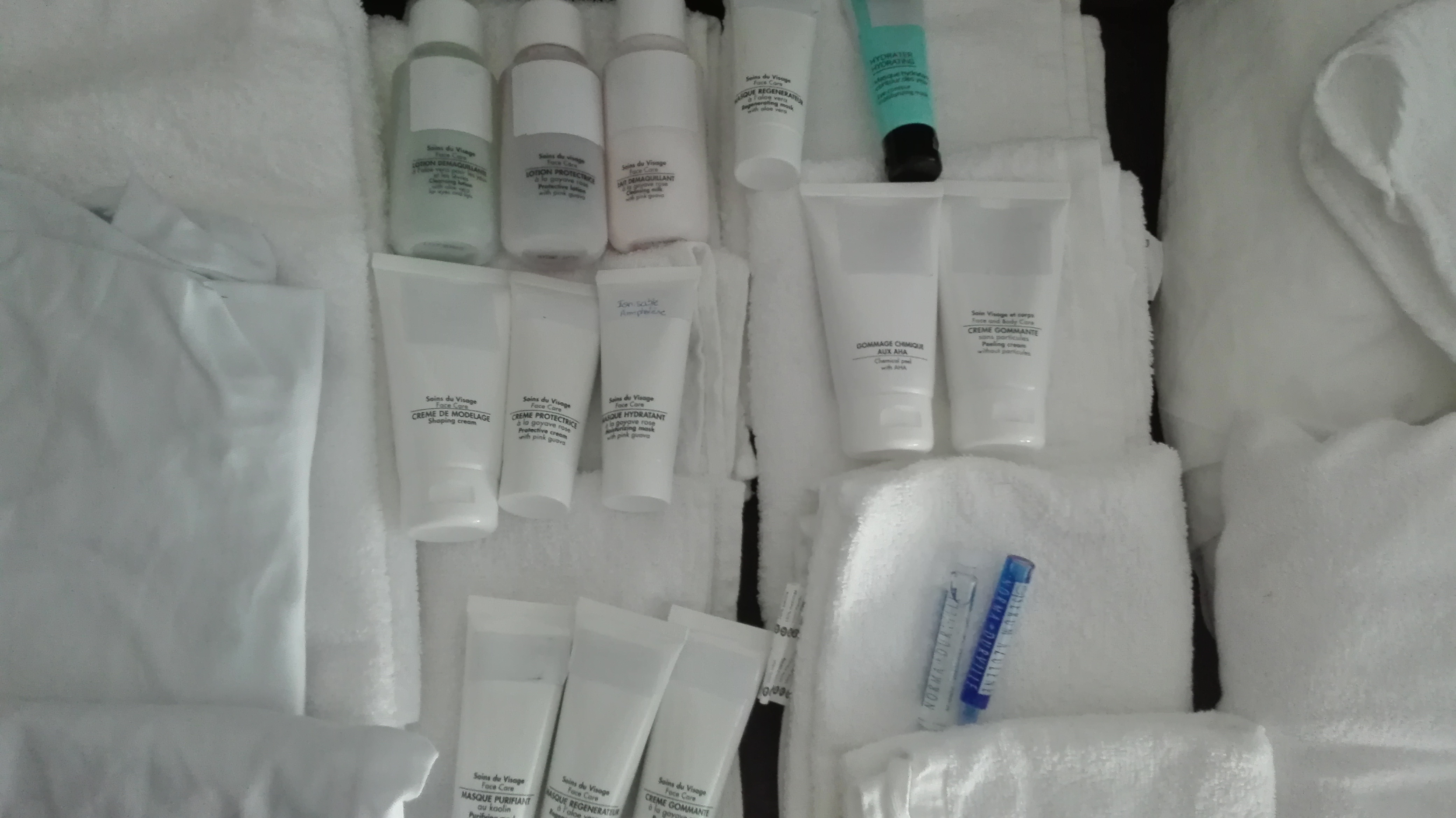 Vous trouverez aussi un kit soin du visage cap acheté 90e et utilisé qu'une fois. On y trouve un masque terreux, un masque crème, un masque contour des yeux, un gommage chimique, deux gommages mécaniques (gomme et grain) un lait démaquillant, une lotion tonique, un démaquillant yeux et lèvres, un masque gel ionisable, ainsi que une ampoule huileuse et coup d'éclat, une crème de modelage, une petite spatule de prélèvement et enfin une crème de jour protectrice.