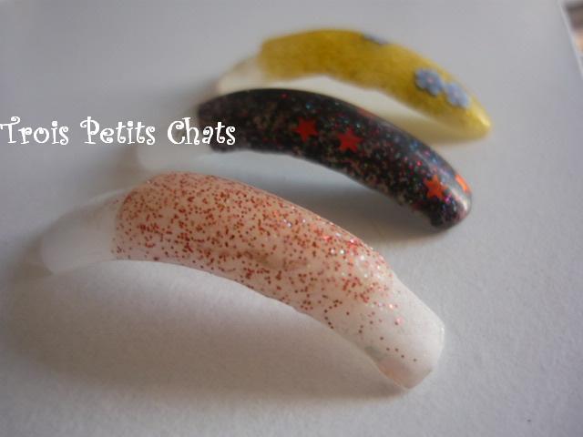 Voici mes essais 1-2 et 3 d'hier + aujourd'hui problème de casse sur pose en gel, aïe !! du coup j'ai limé et fait 1 pose (vite fait j'avoue