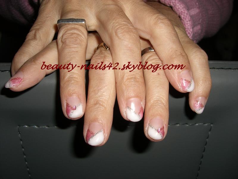 alors je commence par la pose sur ta maman. l idée deco est bien, mais la base est trop courte ca fait pas tres joli. je vois que tu as fais des traits avec des paillettes que tu as certainement melangées avec du gel. j'ai des gels deja pailletés et des paillettes a part aussi. mais les gels pailletés contiennent bcp de paillettes, ce qui permet de faire des traits tres fins. alors je te conseillerais d essayer de mettre beaucoup plus de paillettes mélangées au gel pour obtenir ce genre de consistance. car je trouve le trait un peu grossier du coup (ce qui est normal, vu que les paillettes s'étalent avec le trop de gel). et enfin attention au limage, lime tjs bien la forme de l ongle avant la pose, car si tu dois trop limer apres avoir fait une french, tu risques de l'abimer et il n y a rien de plus ralant!!!