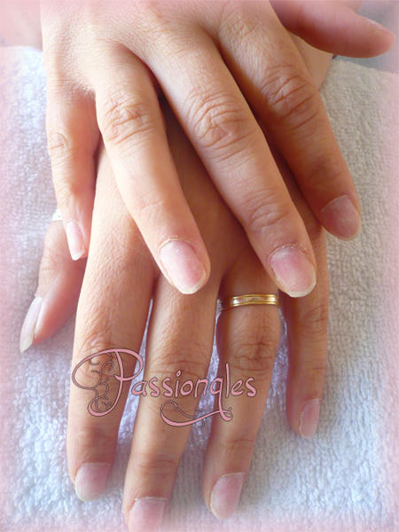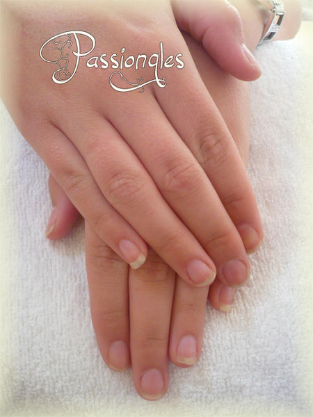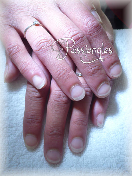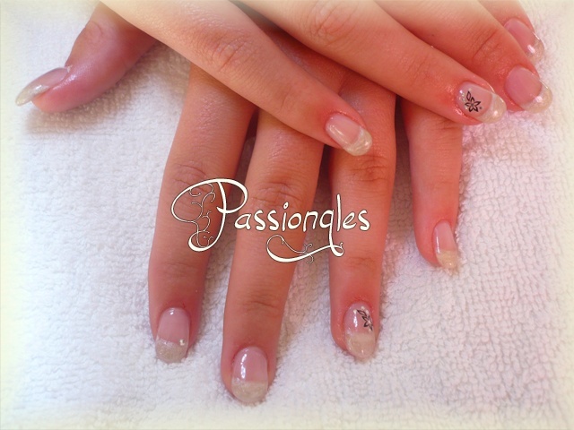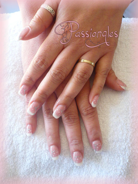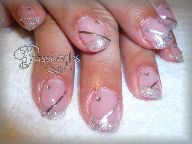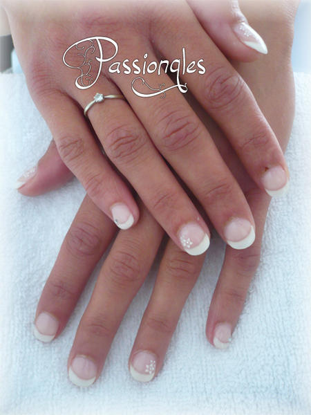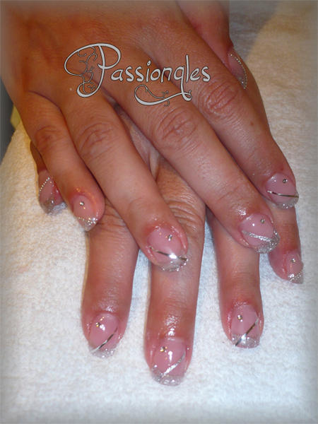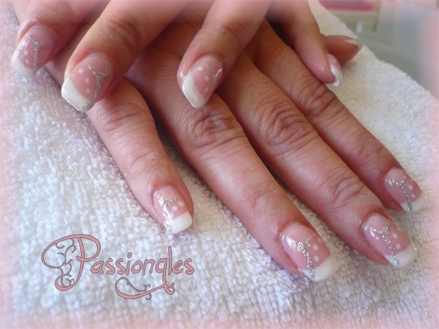 * Dépose capsules et gel puis rallongement french gel blanc et deco facon "aquarium" avec trait gel paillettée blanc avec 3 points blanc gel.