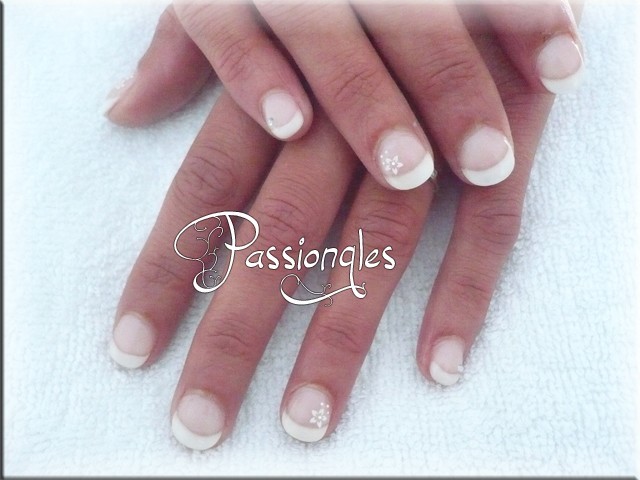 * Gainage et rallongement gel french blanche avec déco stickers Peggy Sage (petites fleurs blanches) et strass.