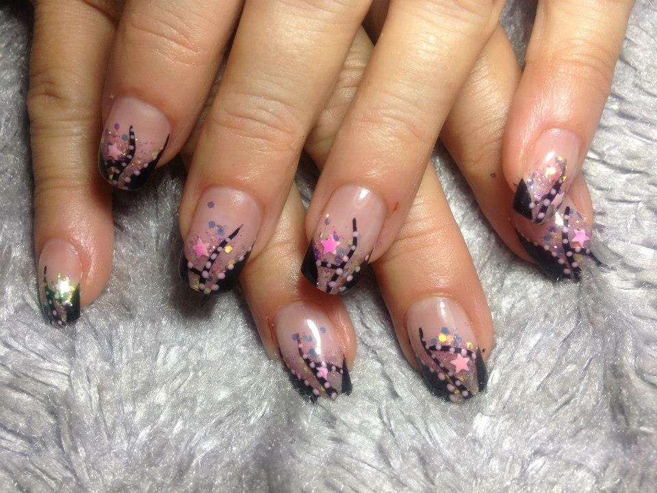 pfiouuu c'est super classe. J'adore ta pose noir avec les étoiles roses et le french pailleté en violet c'est juste au toppp. Et effectivement tu bosses avec quoi??